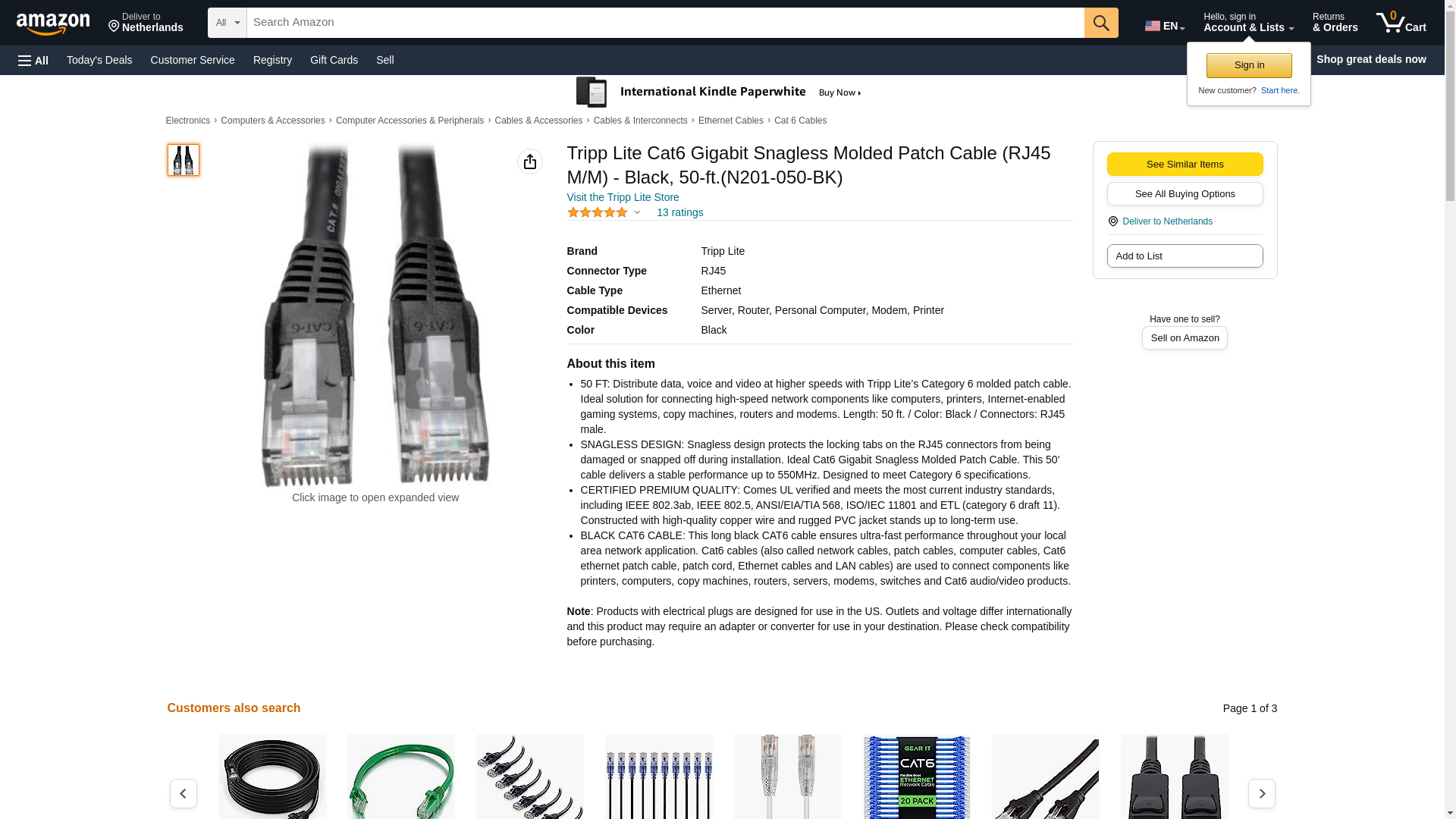 | Feature | Network Cable Type: Patch Cable| Left Connector Gender: Male| Right Connector Gender: Male| Left Connector Type: RJ-45| Right Connector Type: RJ-45| Length: 50 feet| Enclosure Color: Black| Service & Support Type: Limited warranty| RoHS: Y |