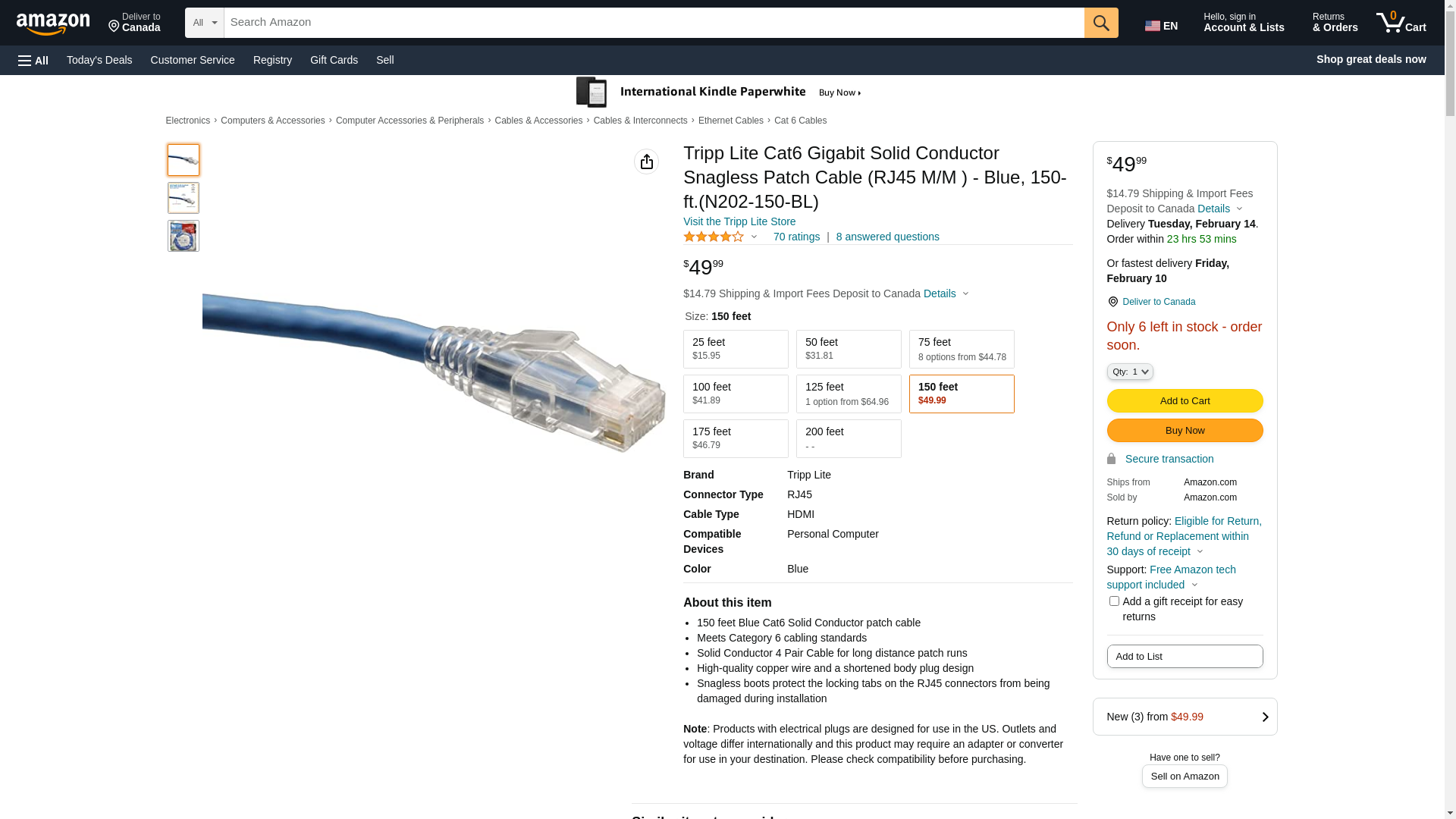 | Feature | "Tripp Lite N202-150-BL 150' Cat6 Patch solid conducto" |