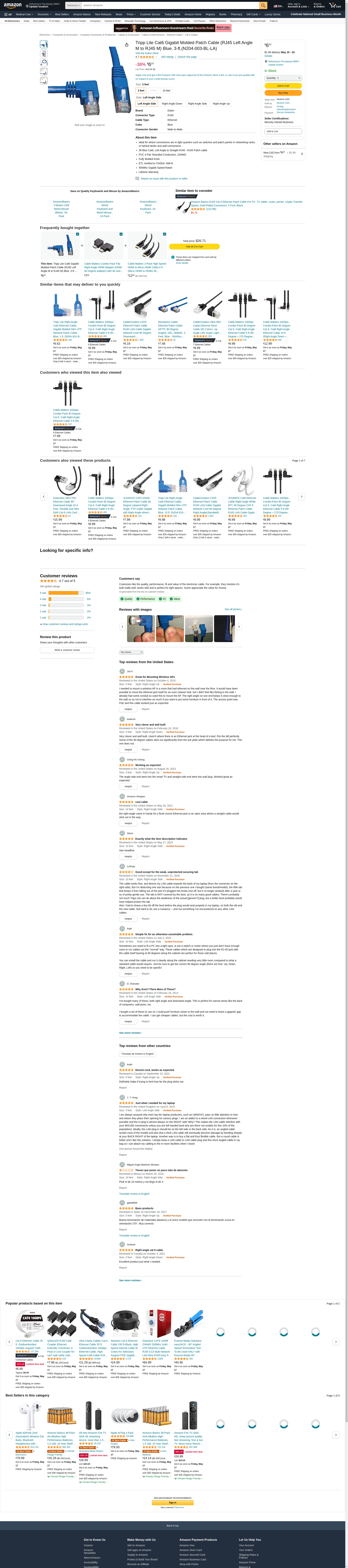 Tripp Lite Cat6 Gigabit Molded Patch Cable (RJ45 Left Angle M to RJ45 M) Blue, 3-ft.(N204-003-BL-LA)