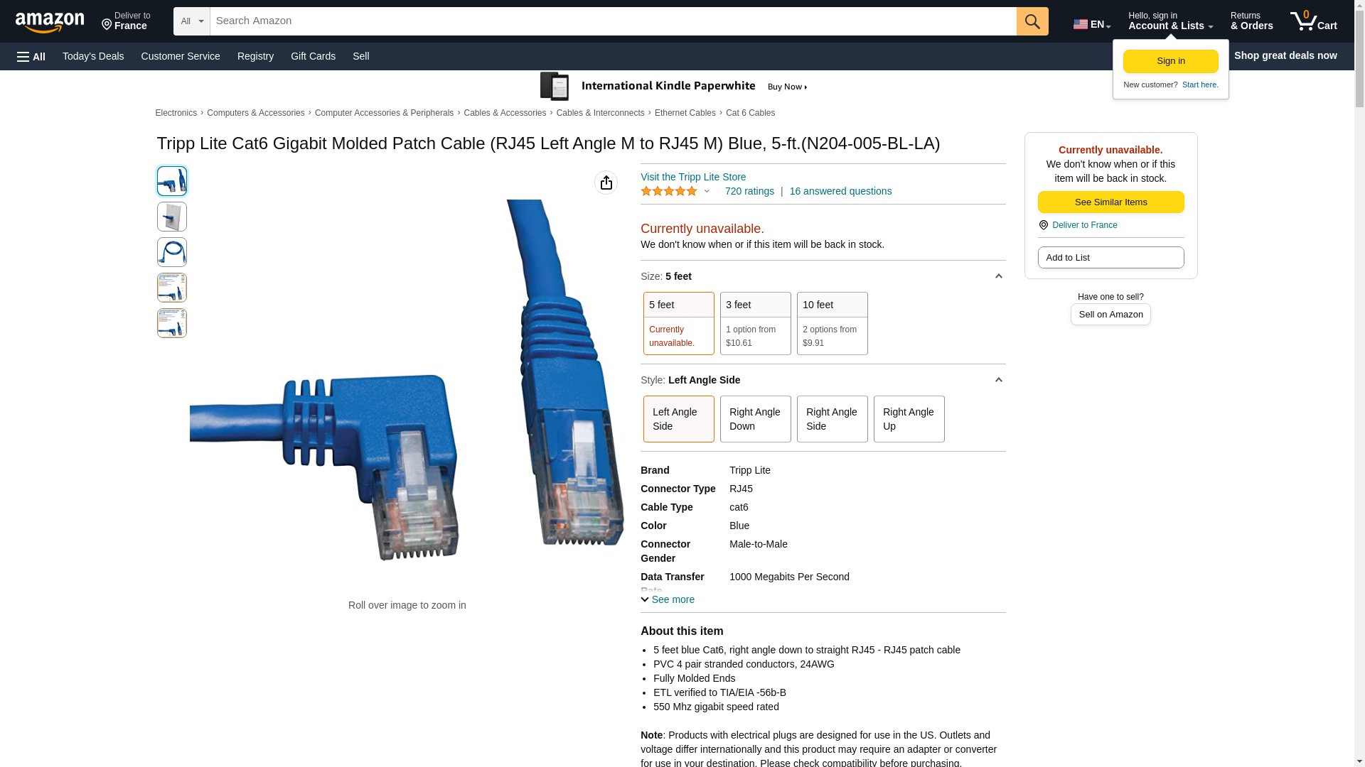 - 5 feet blue Cat6, right angle down to straight RJ45 - RJ45 patch cable