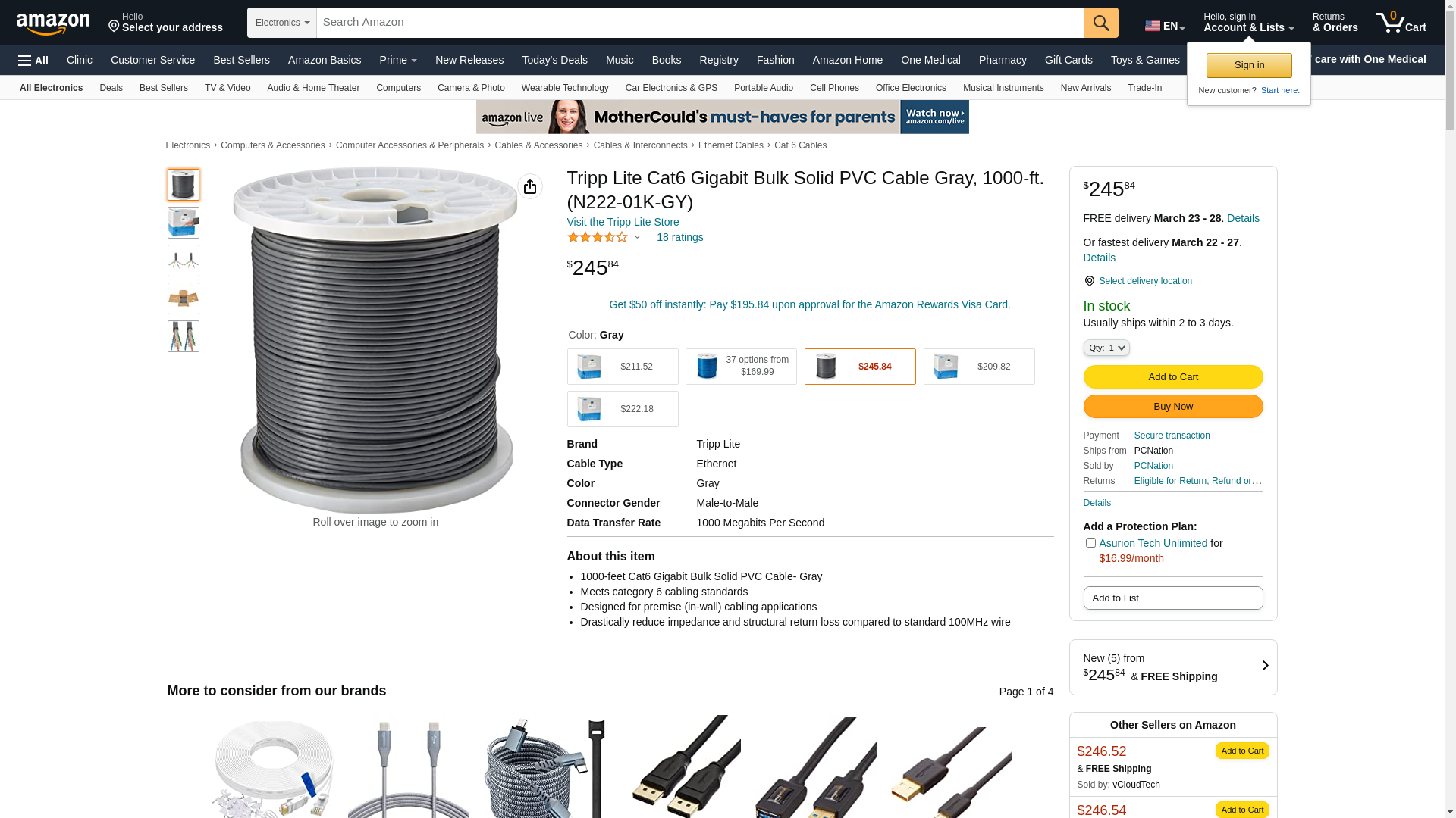 | Feature | 1000-feet Cat6 Gigabit Bulk Solid PVC Cable- Gray |