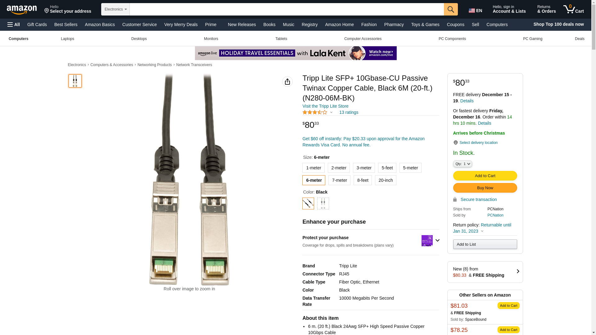 Tripp Lite SFP+ 10Gbase-CU Passive Twinax Copper Cable, Black 6M (20-ft.) (N280-06M-BK)