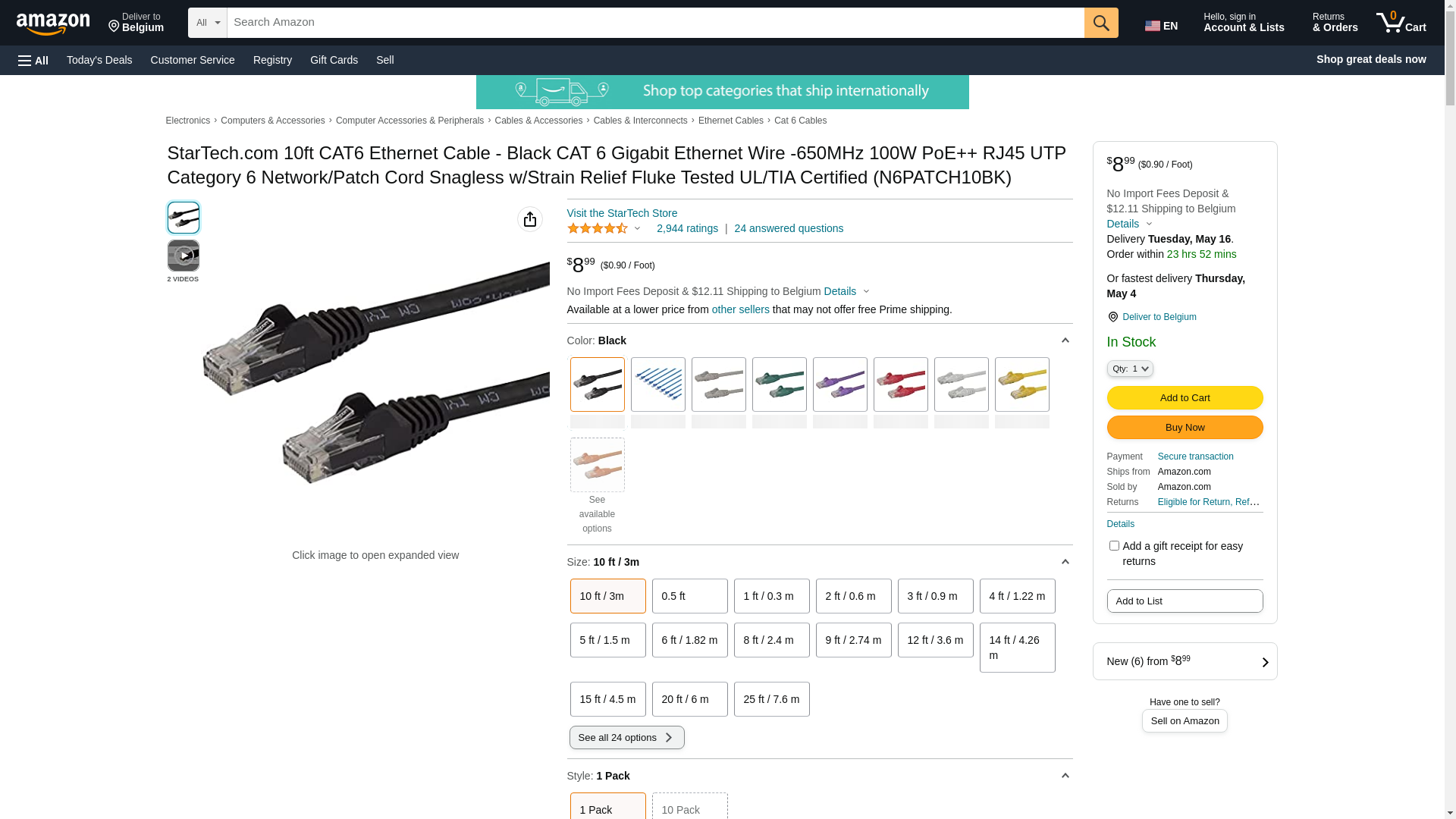 | Feature | Network Cable Type: Patch Cable| Cable Technology: N/A| Left Connector Gender: Male| Right Connector Gender: Male| Left Connector Type: RJ-45| Right Connector Type: RJ-45| Features: Coloured Hoods for departmental colour coding; StarTech Category 6 patch cables are carefully constructed and tested, to keep the Near End Crosstalk (NEXT) well within acceptable limits; Category 6 Patch cables are constructed with top quality components| Length: 10 feet| Enclosure Color: Black |