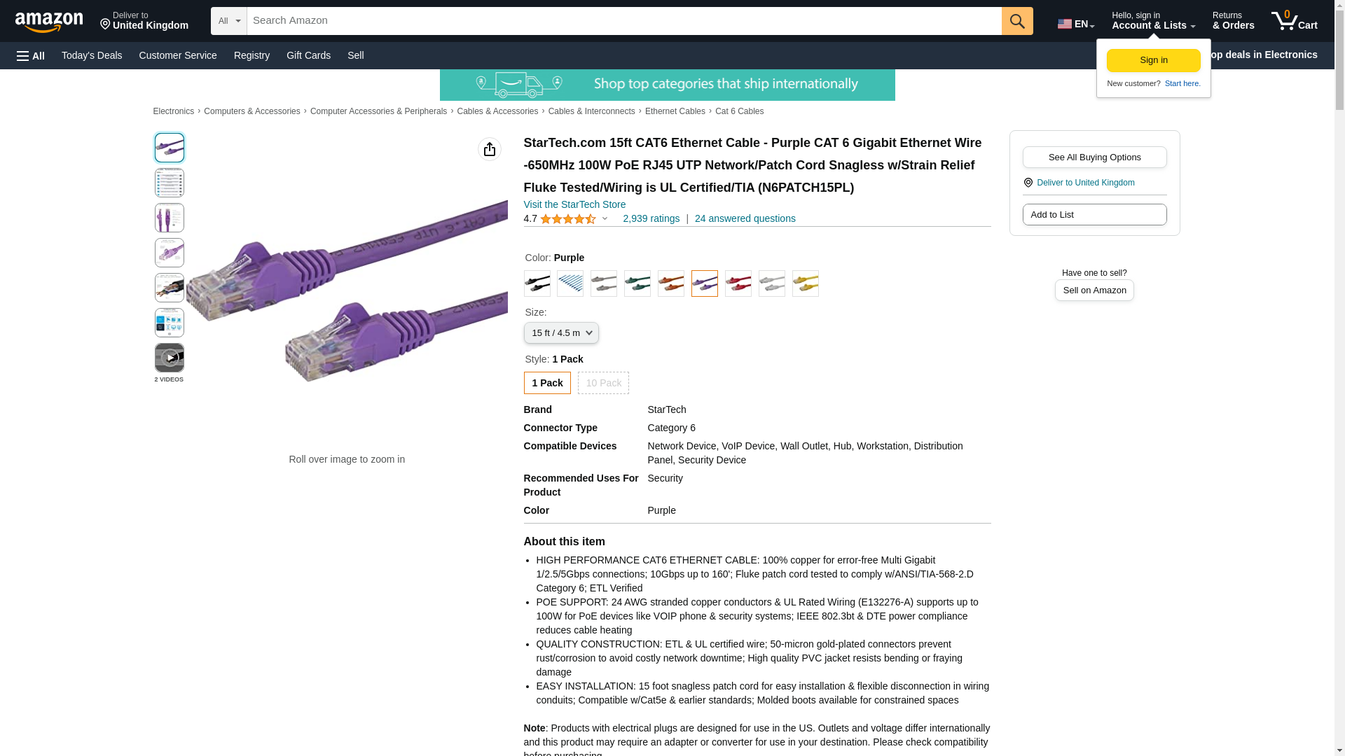 Our Cat6 Snagless UTP patch cables are constructed with 24 gauge copper wire to support a broad range of Ether applications such as Power over Ether (PoE) and feature specialized connector moldings that help prevent snags during cable runs.Primary InformationNetwork Cable Type : Patch Cable Cable Technology : Unshielded twisted pair (UTP) Left Connector Gender : Male Right Connector Gender : Male Left Connector Type : RJ-45 Right Connector Type : RJ-45 Networking / Compliant Standards : TIA/EIA-568-B.1-2001 T568B Dimensions&MiscellaneousLength : 15 feet Enclosure Color : Purple Service&SupportService & Support Type : Lifetime warranty Special FeatureRoHS : Y UNSPSC CodeUNSPSC Code : 26121609