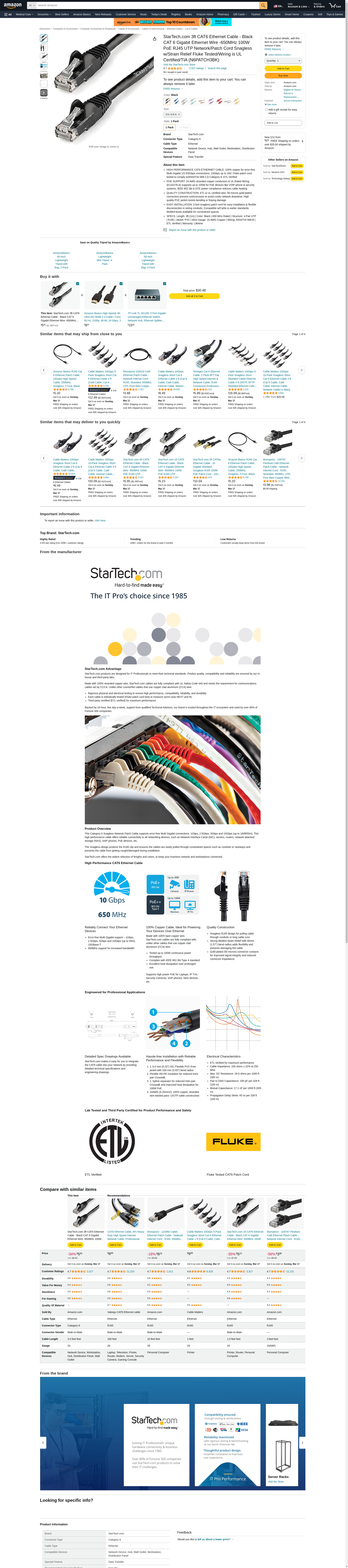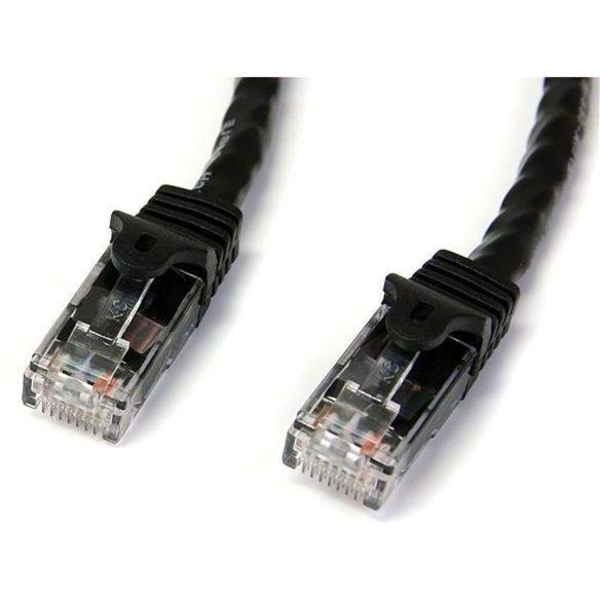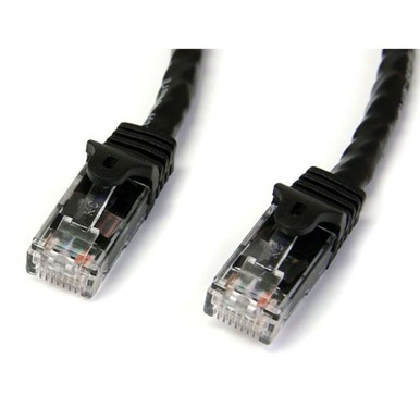 Make Power-over-Ethernet-capable Gigabit network connections - 3ft Cat6 Cable / 3' Ethernet Patch Cable / 3 ft Gigabit Cat6 Cable - Black Gigabit Snagless Cat6 Patch Cable / ETL Verified / UTP Cat 6 Cable - 3 ft RJ45 Male to Male Patch Cord - 24 AWG / 100% Copper / 50-micron Gold Connectors - Designed for use with Gigabit networks - Patches from hub to distribution panel - Connects workstation to wall outlet - Guaranteed reliability with a lifetime warranty RJ45 connector clip protectors help keep the plugs from snagging while routing the cable, for easier Cat 6 cable runs. RJ45 connector clip protectors. Carefully constructed and tested, to keep Near End Crosstalk (NEXT) well within acceptable limits. Colored hoods for departmental color coding. Molded strain relief prevents the cable from being bent at sharp angles at the RJ45 connector, to minimize the stress at the plug termination point. Constructed with top quality components. Backed by StarTech lifetime warranty. Constructed with top quality components.