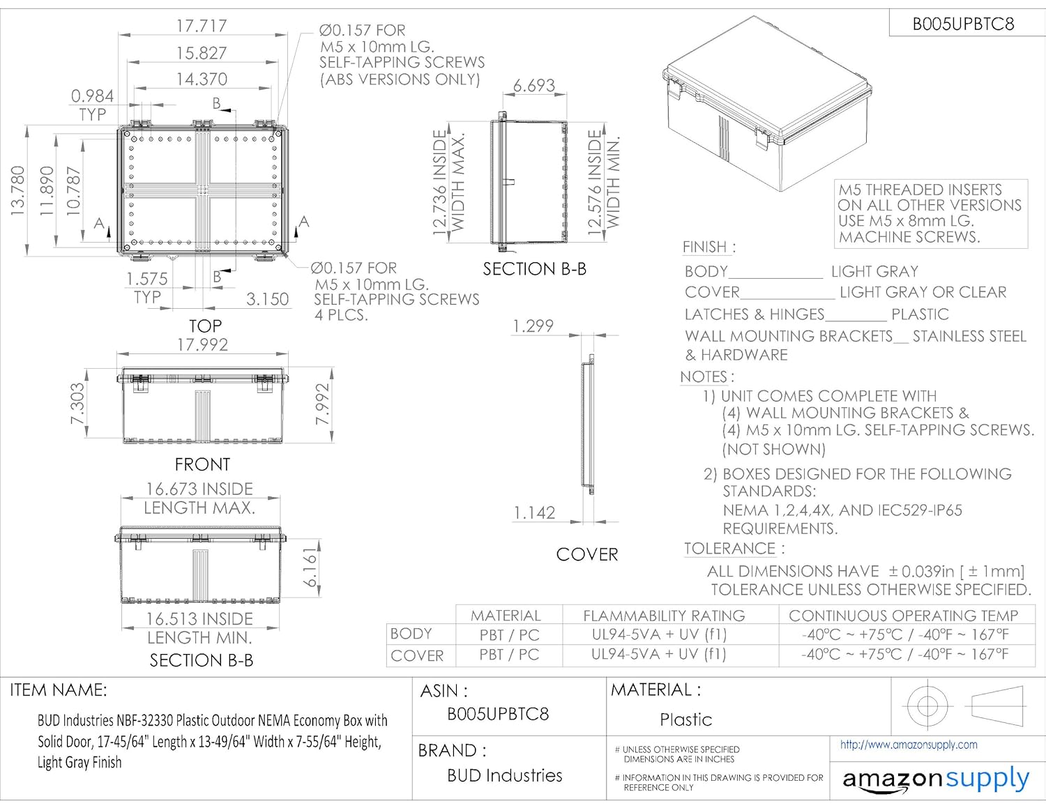 BUD Industries NBF-32330 Plastic Outdoor NEMA Economy Box 17.71" L x 13.78" W x 7.87" H, Gray