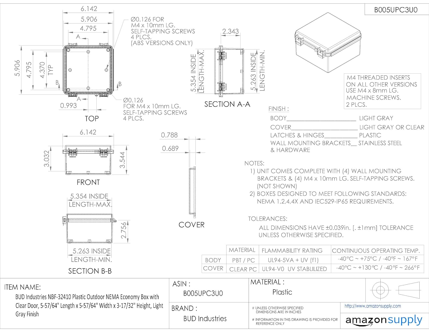 BUD Industries NBF-32410 Plastic Outdoor NEMA Economy Box 5.9" L x 5.9" W x 3.54" H, Gray