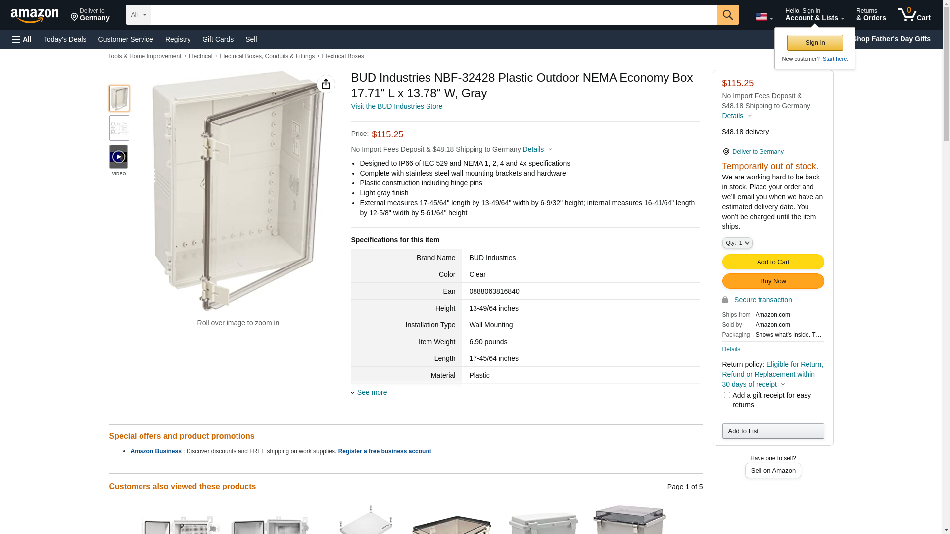 BUD Industries NBF-32428 Plastic Outdoor NEMA Economy Box 17.71" L x 13.78" W x 6.42" H, Gray