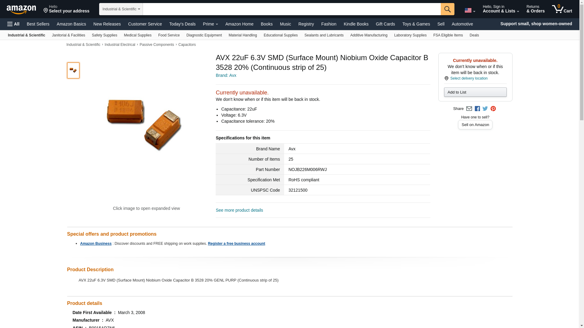 AVX 22uF 6.3V SMD (Surface Mount) Niobium Oxide Capacitor B 3528 20% GENL PURP (Continuous strip of 25)