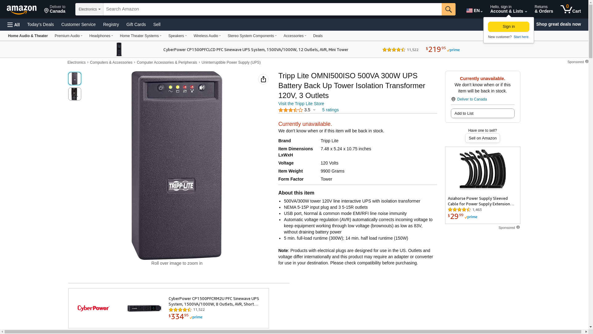 - 500VA/300W tower 120V line interactive UPS with isolation transformer
