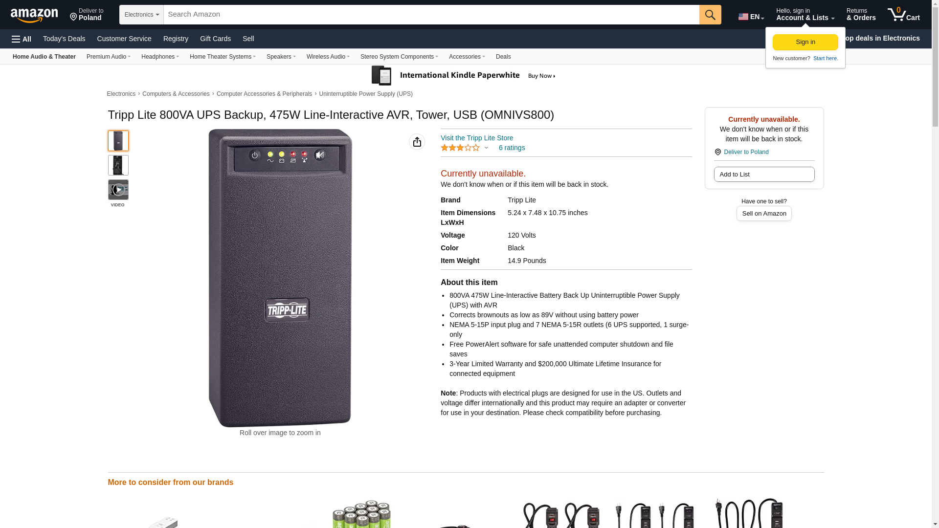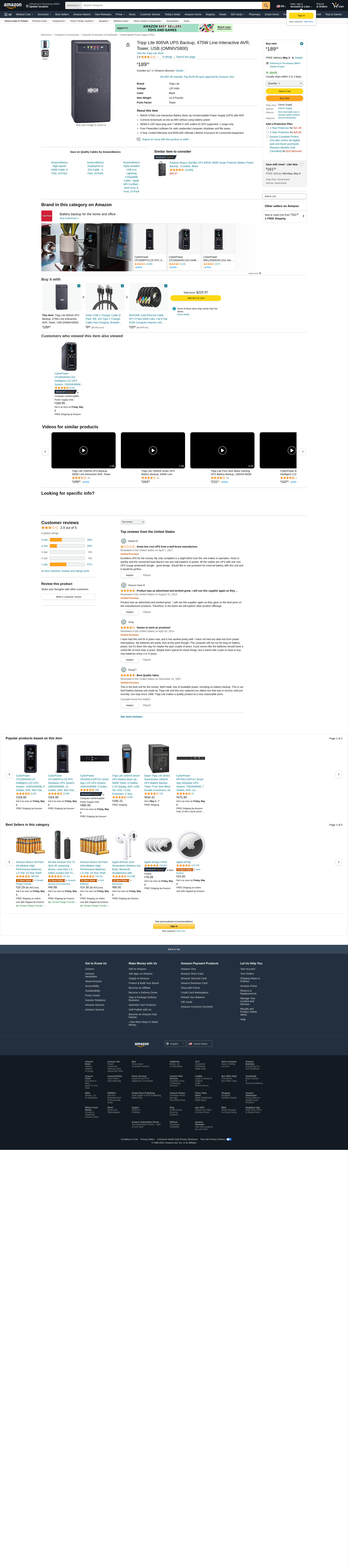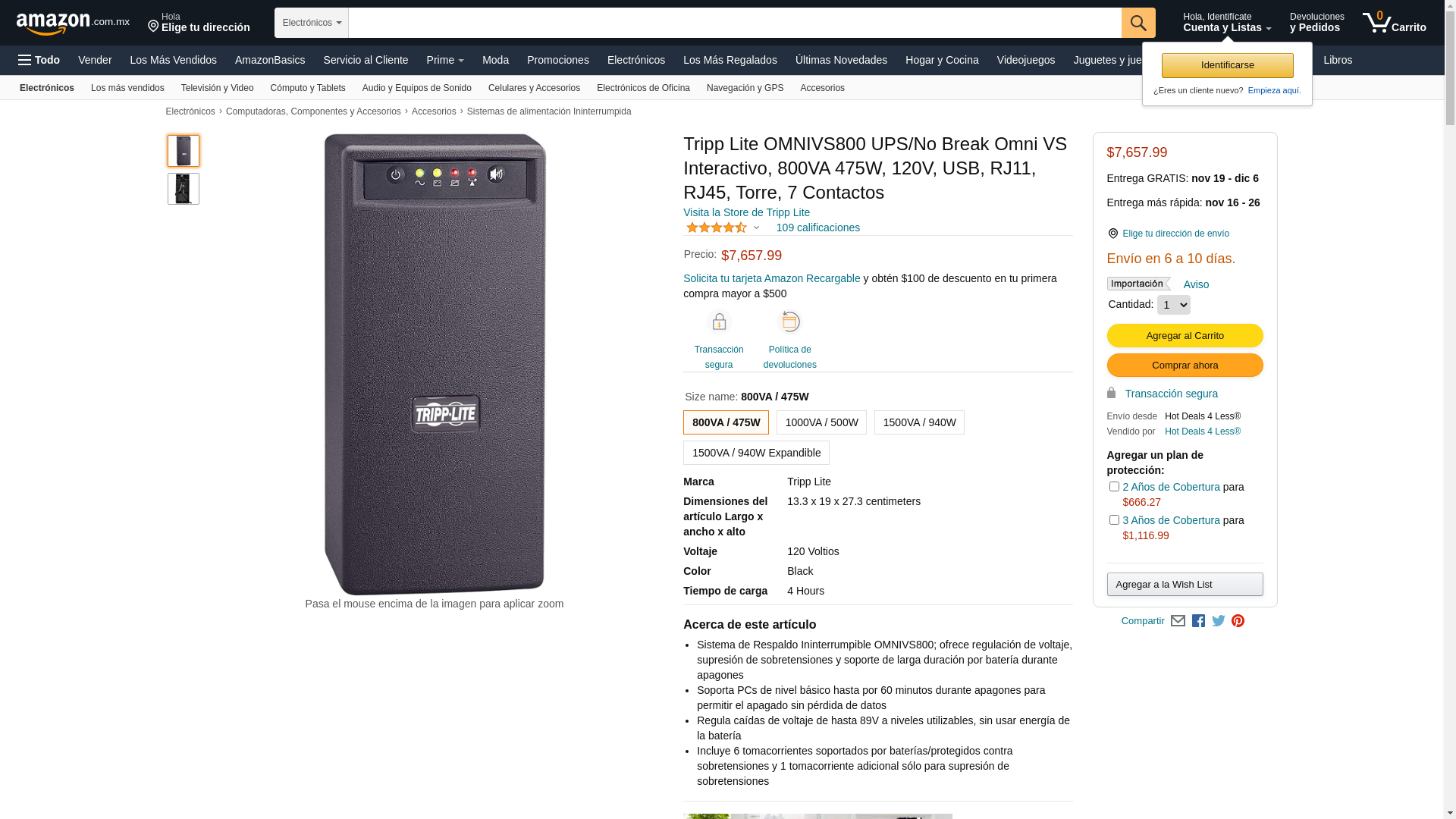 Tripp Lite Ups External Ac 120v 475w/800va : Tripp Lite's OMNIVS800 line interactive UPS system offers voltage regulation surge suppression and long lasting battery support for personal computers internetworking equipment and other sensitive electronics. Internal UPS circuits support entry-level PC systems for up to 60 minutes during power failures so that connected equipment can be shut down without data loss. Automatic Voltage Regulation (AVR) circuits regulate brownouts as low as 83 volts back to usable levels without using battery power. Offers complete desktop power protection in an attractive black tower configuration. Primary InformationPower Device Type??:????UPS??UPS Technology??:????line-interactive??Voltage Provided??:????AC 120 V??Voltage Required??:????AC 120 V??Power Device / Form Factor??:????External??Dimensions&MiscellaneousWidth??:????5.25 Inch??Depth??:????7.25 Inch??Height??:????10.75 Inch??Weight??:????21.2 lbs.??Compliant Standards??:????Tested to UL1778 (USA) CSA C22.2 No. 107.3 (Canada) Class B (emissions) NOM (Mexico) FCC Part 68 / Industry Canada (telecommunications) RoHS Compliant??Enclosure Color??:????Black??PowerPower Provided??:????475 Watt / 800 VA??Surge Suppression??:????Standard??BatteryBattery Type??:????UPS battery??Battery Technology??:????Lead-Acid battery??Battery / Run Time??:????6 min at full load Min??ConnectionInterfaces & Connections??:????Interfaces: 1 x USB - 4 pin USB Type B??Input Connector(s)??:????1 x power NEMA 5-15??Output Connector(s)??:????6 x power NEMA 5-15 ( UPS and surge ) 1 x power NEMA 5-15 ( surge )??Service&SupportService & Support Type??:????2 years warranty??Special FeatureRoHS??:????Yes??UNSPSC CodeUNSPSC Code??:????39121011??Product IDUPC:????037332120953Manufacturer Part:????OMNIVS800