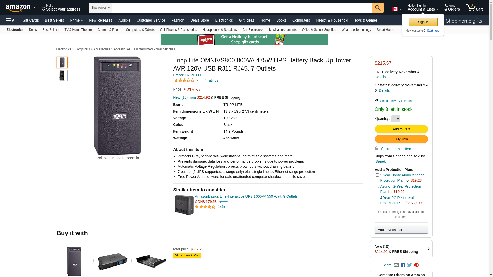 | Feature | Power Device Type: UPS| UPS Technology: line-interactive| Voltage Output: AC 120 V| Voltage Input: AC 120 V| Power Device / Form Factor: Tower| Features: Cables Included 1 x USB cable, 1 x phone cable| Width: 5.25 Inch| Depth: 7.25 Inch| Height: 10.75 Inch| Compliant Standards: Tested to UL1778 (USA), CSA C22.2 No. 107.3 (Canada), Class B (emissions), NOM (Mexico), FCC Part 68 / Industry Canada (telecommunications), RoHS Compliant| Enclosure Color: Black| Power Provided (W): 475 Watt |