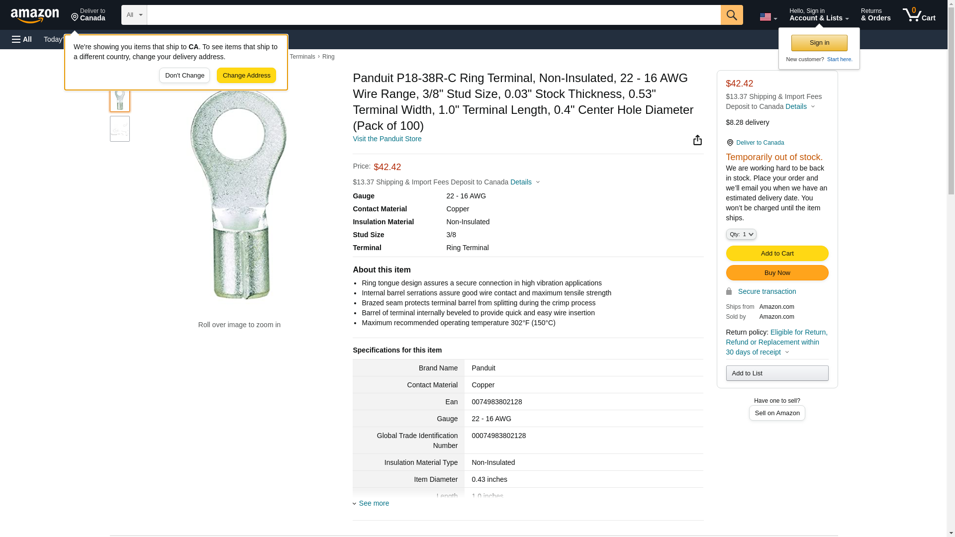 Panduit P18-38R-C Ring Terminal, Non-Insulated, 22 - 16 AWG Wire Range, 3/8" Stud Size, 0.03" Stock Thickness, 0.53" Terminal Width, 1.0" Terminal Length, 0.4" Center Hole Diameter (Pack of 100)