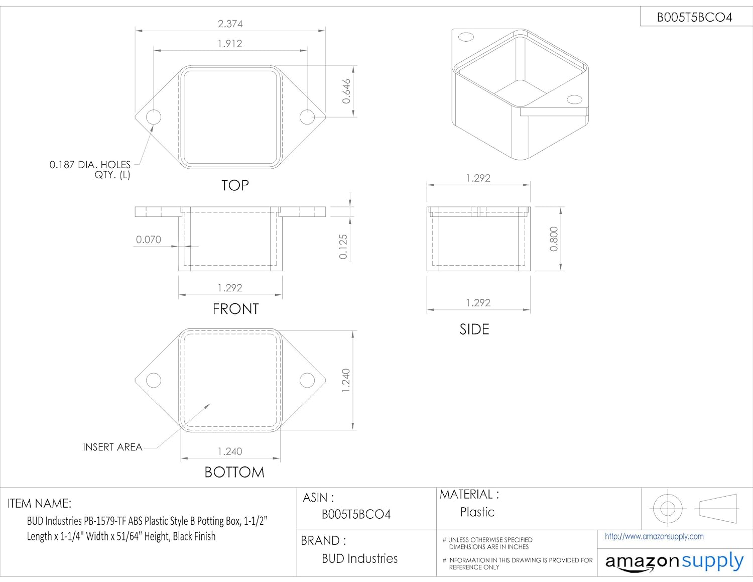 BUD Industries PB-1579-TF ABS Plastic Style B Potting Box 1.5" L x 1.25" W x 0.80" H, Black