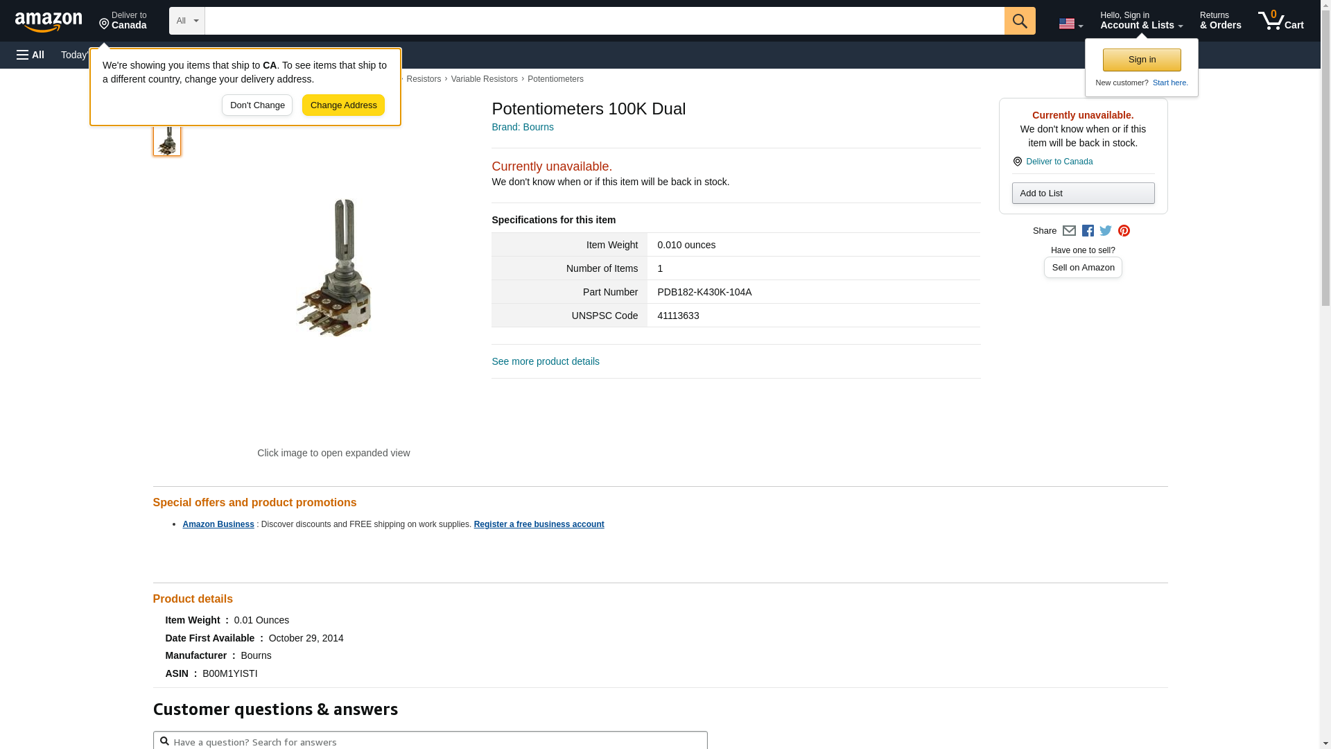 | Feature | <b>Price For:</b> Pack of 50<b>Order Unit:</b> Kit of\xa01 <b>Adjustment Type:</b>: Screwdriver Slot <b>No. of Gangs:</b>: 2 <b>No. of Turns:</b>: 1 <b>Potentiometer Mounting:</b>: Panel <b>Power Rating:</b>: 60 <b>Product Range:</b>: PDB182 Series <b>Resistance Tolerance:</b>: \xb1 20% <b>SVHC:</b>: No SVHC (17-Dec-2014) <b>Shaft Diameter:</b>: 6 <b>Shaft Length:</b>: 30 <b>Track Resistance:</b>: 100 <b>Track Taper:</b>: Log (Audio) <b>Voltage Rating:</b>: 150 |