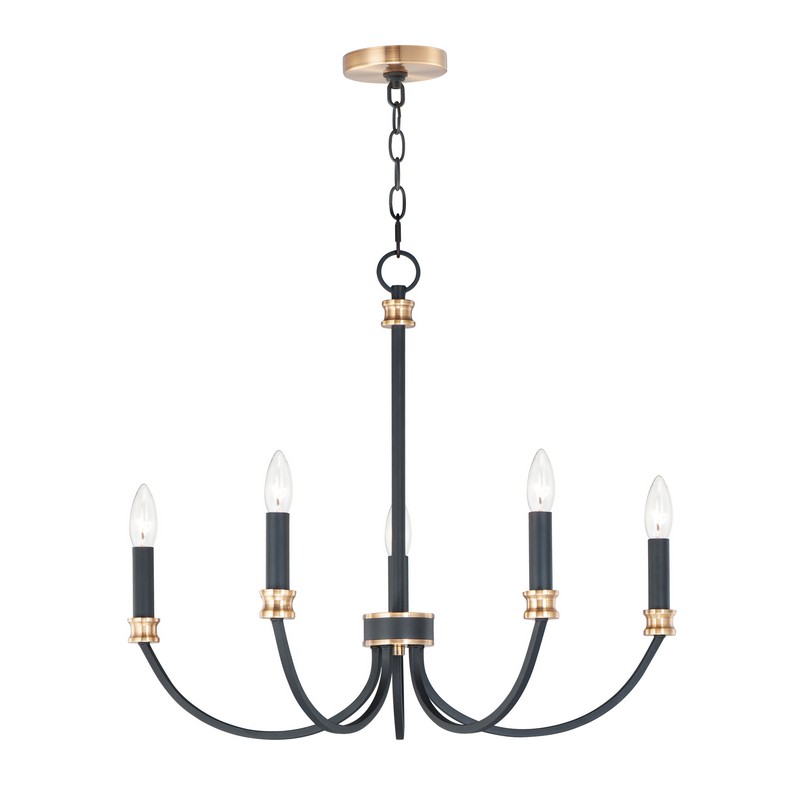 - Five-light metal chandelier from the Charlton collection by Maxim.