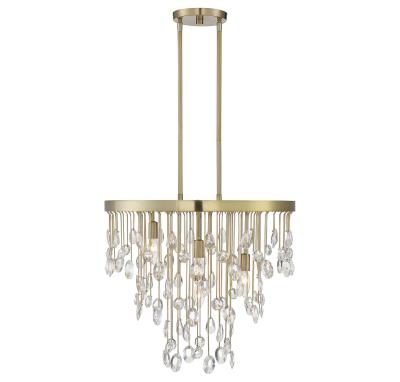If you are looking for lighting that makes a big style statement, look no further than this Savoy House Livorno 4-light pendant. Every aspect of Livorno isthoughtfully designed to create the biggest impact, from the lights that hang at different heights to the 3 tiers of beautifully faceted crystals in different shapes and sizes. This is the perfect way to indulge your craving for updated Hollywood Regency glamour in any room, including foyers, living rooms, kitchens and bedrooms. Finished in Noble Brass. This fixture is 21" wide and has an adjustable height that ranges from 19" to 76". Uses 4 candelabra size bulbs of up to 60 watts each (not included).
