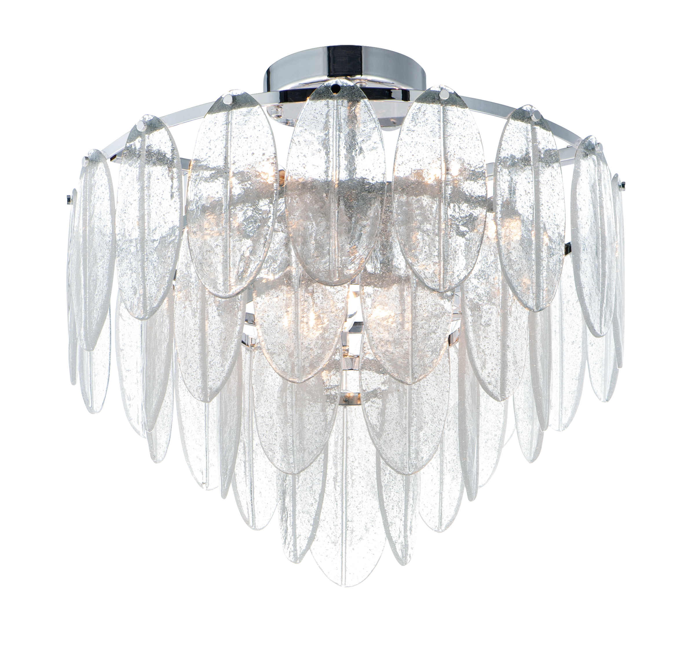 Hand formed glass petals suspend from a tiered frame of Polished Chrome. The glass is transparent yet cloudy, softly diffusing the light while creating a clean and crisp design. Canopy Included: Yes / Canopy Diameter: 7.00 / Dimable: Yes / Shade Included: Yes.