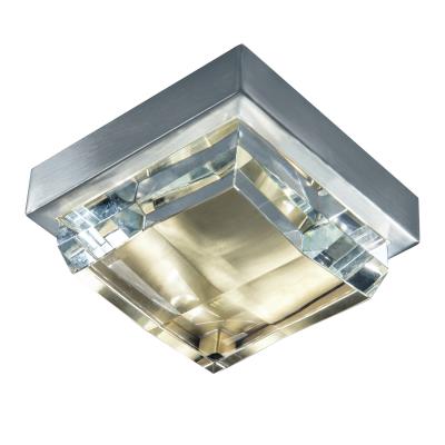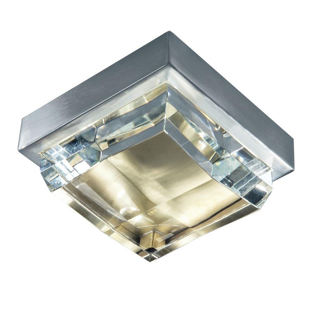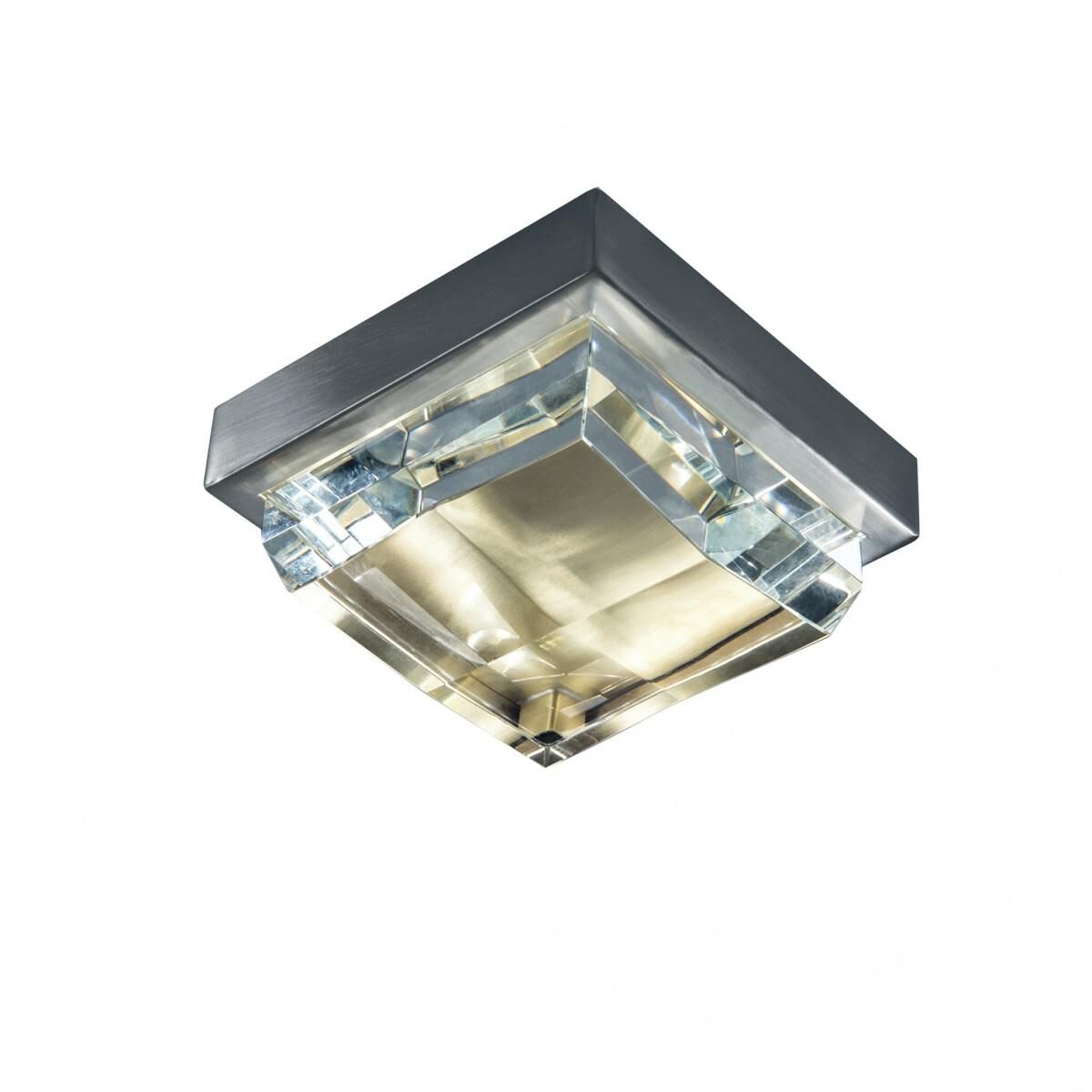 This transitional flush mount features a small-scale width of just 6 3/8 inches square. The stunning faceted crystal glass is 2 inches thick. The Brushed Nickel and Satin Brass compliment the glass perfectly. This fixture can be used both by itself and in Color Temperature: 3000K / Lumens: 270 / Manufacturer Warranty: 3 Years / CRI: 80 / Mounting Direction: Down / Assembly Required: Yes / Canopy Included: Yes / Shade Included: Yes / Canopy Diameter: 4.4 x 0.5.