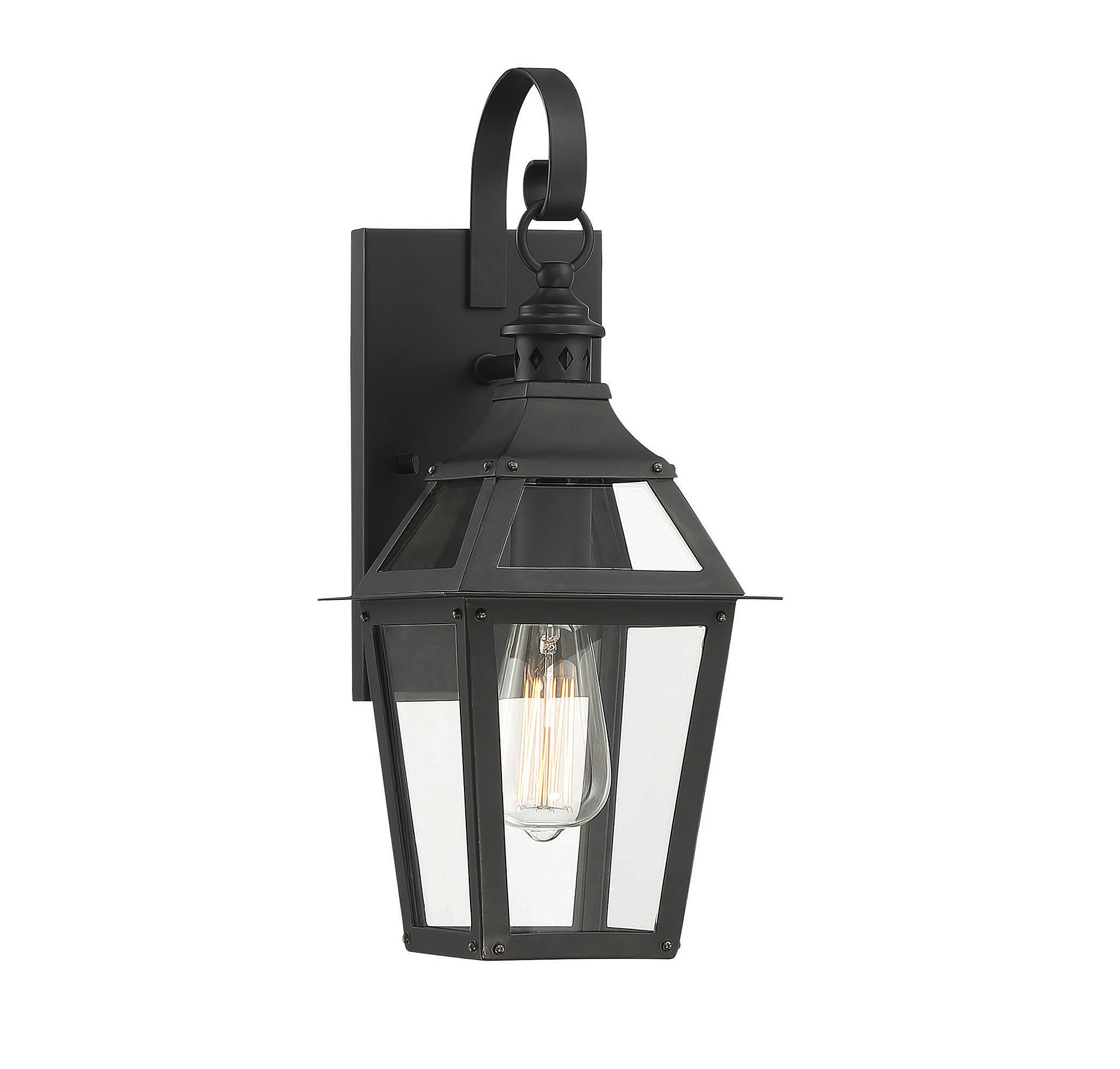 This Savoy House Jackson 1-light outdoor wall lantern is the perfect way to easily boost your home’s curb appeal. It is crafted in a classic, timeless style with boldly angled curves, eye-catching pierced metal detail and a dramatic shepherd’s hook. Panes of clear glass ensure a bright, beautiful glow and a generously sized backplate will help to cover any holes left from replacing previous fixtures. Jackson is finished in black with gold highlights to go well with anything and add a touch of glamour. Use this lantern beside your front and side doors or above your garage door. This fixture is 7" wide and 17.5" tall. It extends 7.813" from the wall. Uses a standard size bulb of up to 60 watts (not included).