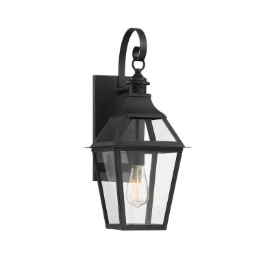 This Savoy House Jackson 1-light outdoor wall lantern is the perfect way to easily boost your home’s curb appeal. It is crafted in a classic, timeless style with boldly angled curves, eye-catching pierced metal detail and a dramatic shepherd’s hook. Panes of clear glass ensure a bright, beautiful glow and a generously sized backplate will help to cover any holes left from replacing previous fixtures. Jackson is finished in black with gold highlights to go well with anything and add a touch of glamour. Use this lantern beside your front and side doors or above your garage door. This fixture is 9" wide and 22.38" tall. It extends 9.88" from the wall. Uses a standard size bulb of up to 60 watts (not included).
