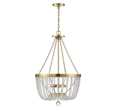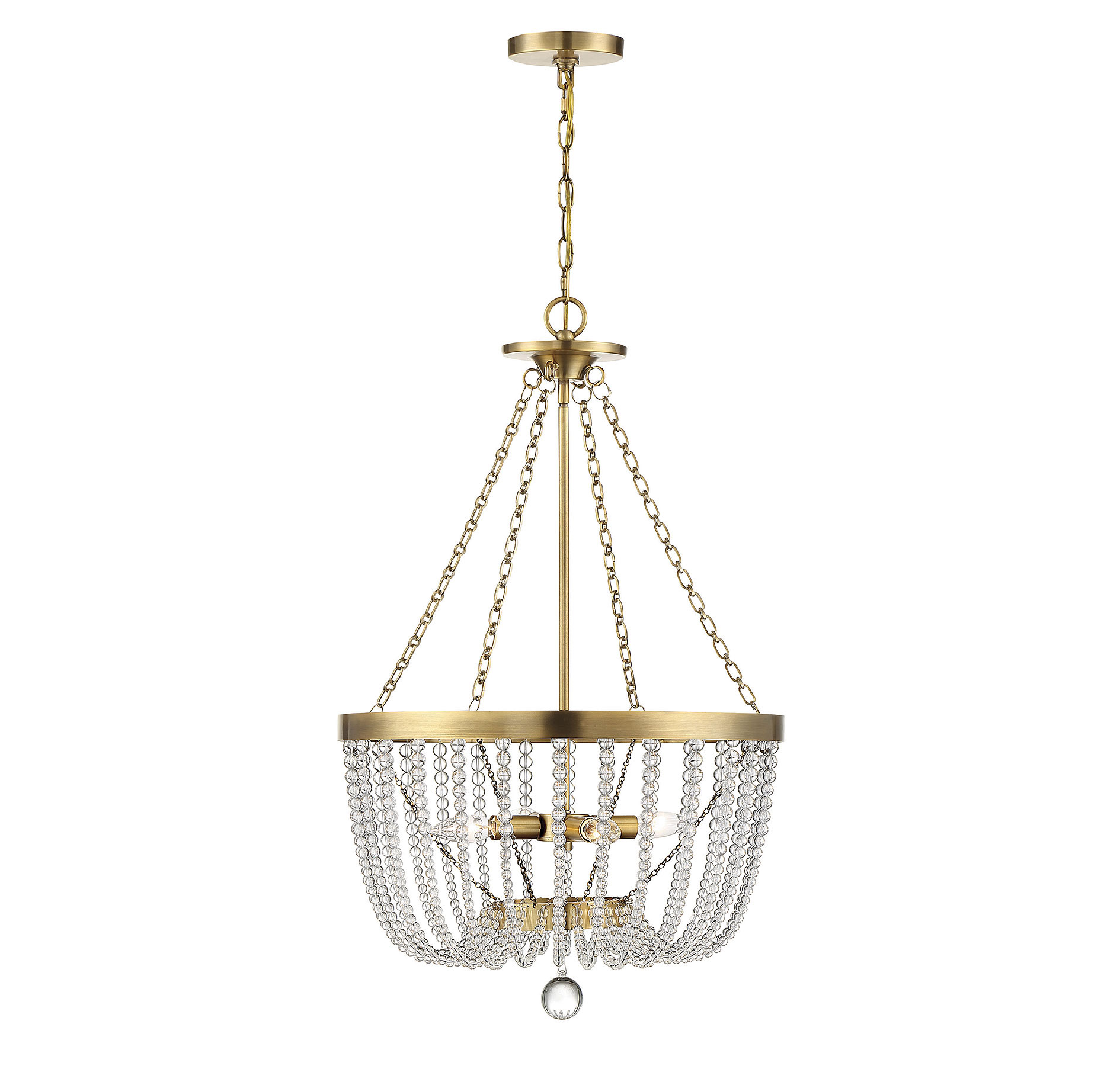 The glamorous Savoy House Bergamo 4-light pendant is smartly tailored, totally unfussy jewelry for your home. Adorned with rows of dramatically draped glass clear crystal orbs, finished in warm brass and topped off with a perfectly placed oversized bauble as a finial, Bergamo is truly a sight to behold. Perfect for adding a big touch of glamour to anywhere it hangs, from a kitchen to a bedroom, a living room to a closet. This fixture is 19.88" wide and 32.25" tall. Uses 4 candelabra-size light bulbs of up to 60 watts each (not included).