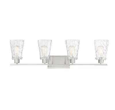 If you want a fresh, elegant lighting look in your bathroom, the Savoy House Vaughan 4-light bath bar is the perfect choice. Its sleek design showcases tall fluted shades of clear water glass that are held snugly in place with clasps and screws. The satin nickel finish works beautifully with many different colors of bathroom furnishings and hardware. This fixture is 32.5" wide and 9.25" tall. It extends 6ï¾" from the wall. Uses 4 standard size bulbs of up to 60 watts each (not included).