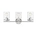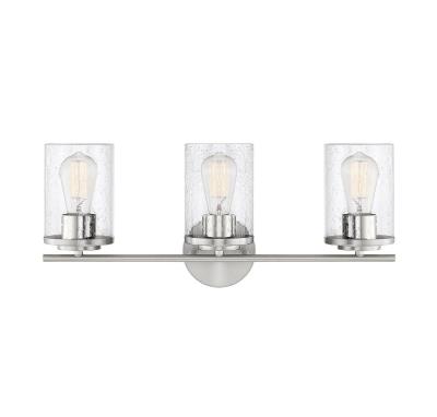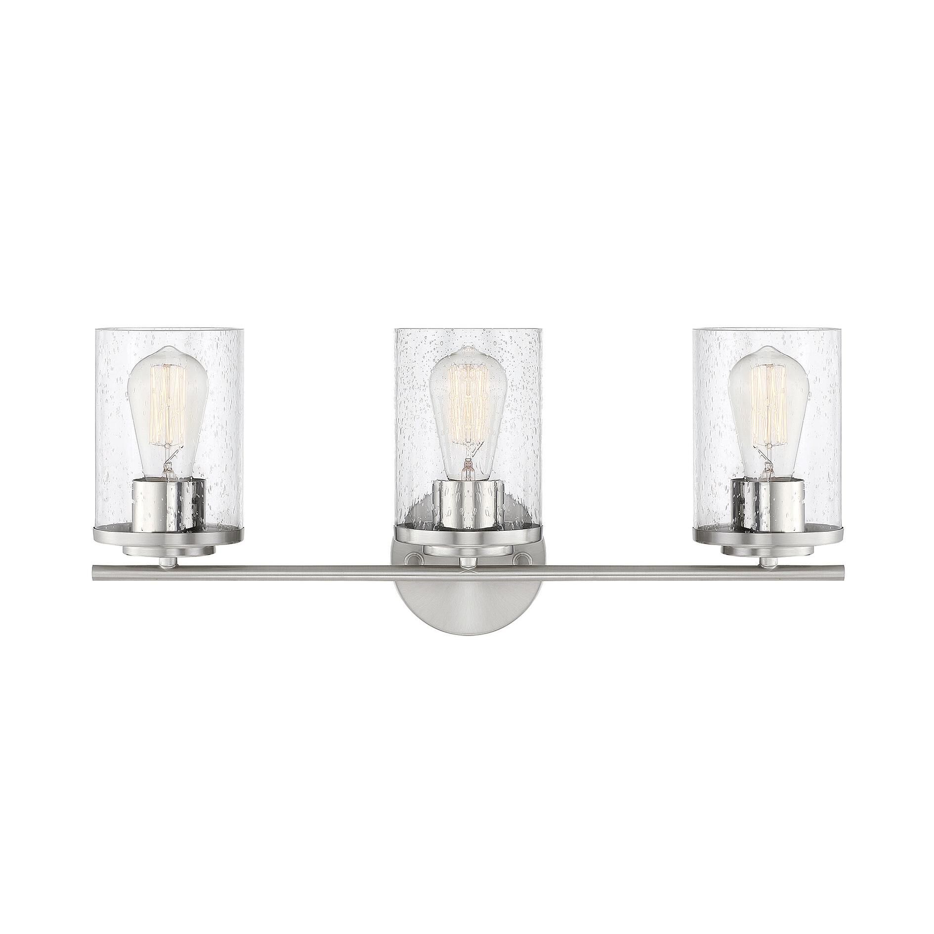 Illuminate your vanity mirror beautifully with this Savoy House Marshall 3-light bath bar. Its classic Americana look fits in perfectly with a wide variety of decor styles. The hurricane-style shades of clear seeded glass add a boost of drama and intrigue and the circular backplate brings in another dimension of thoughtful detailing. Finished in chrome. This fixture is 22" wide and 9.5" tall. It extends 6.5" from the wall. Uses 3 standard size bulbs of up to 60 watts each (not included).