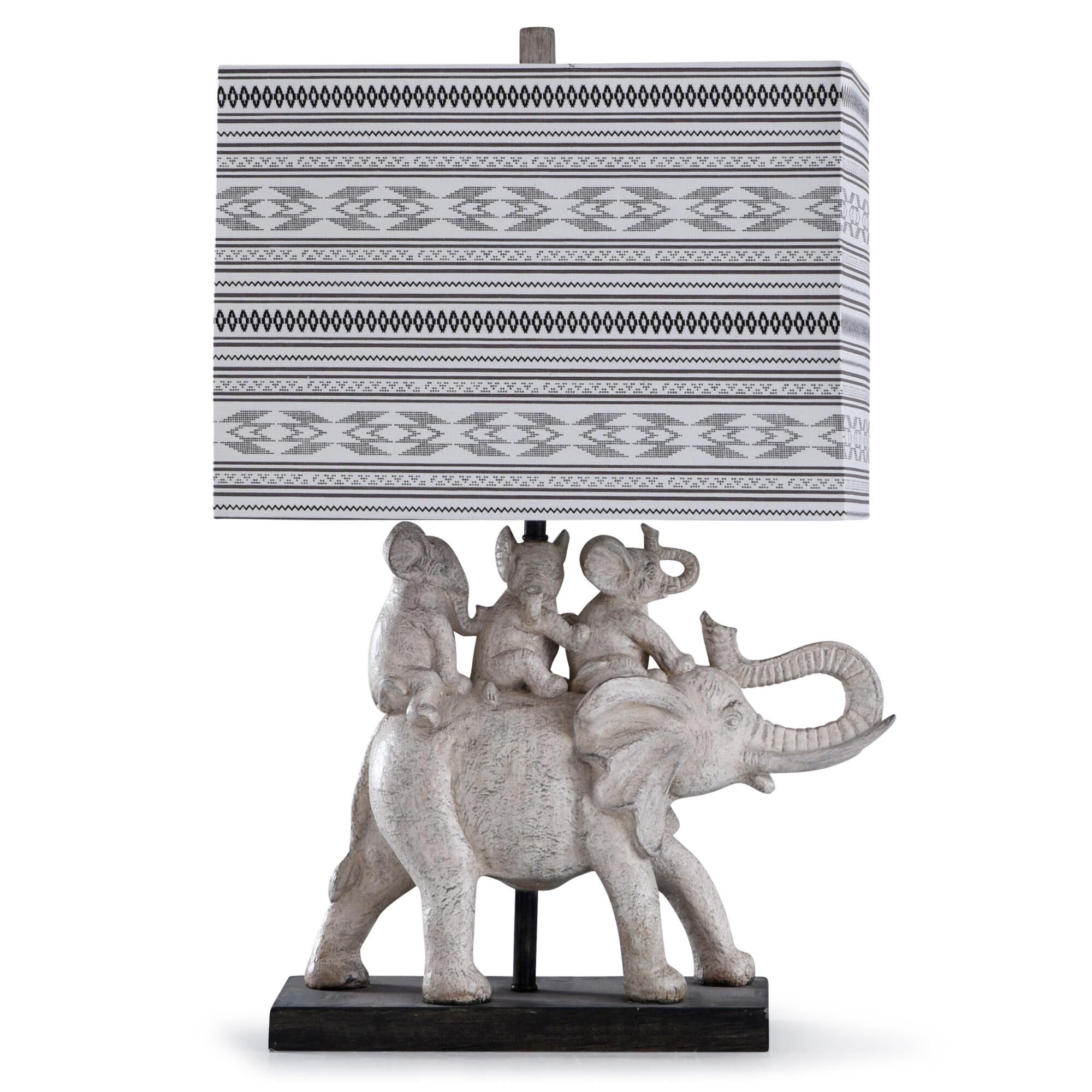 Collection: Dapple, Finish Color: Gray/Brown, Width: 5.25", Height: 28", Length: 16.5", Number Of Bulbs: 1, Wattage: 100 Watts, Moisture Rating: Dry Rated, Desc: This exceptional global style table lamp leaves no detail unaddressed. A powerful image stampedes through the polyresin frame, with grey elephants stationed on a brown base. The rectangular linen and polyester shade features a dapple grey designer pattern. With so much artistry to take in, this piece makes a grand statement in foyers, offices and living rooms. Portable base - 6.25"L x 13.25"W x 1.25"H Shade Shape - Rectangle Shade Dimension - 10 L x 10 W. 6.25 x 13.25 x 1.25Rectangle / Assembly Required: Yes / Shade Included: Yes / Cord Length: 60.00. ,