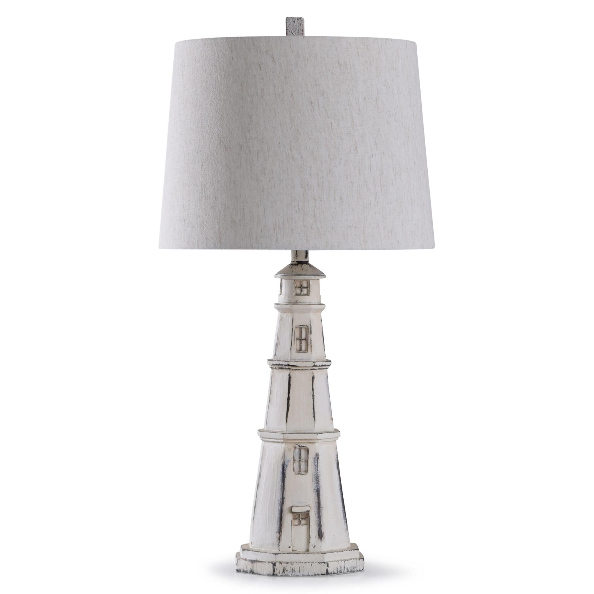 Collection: Berwyn, Finish Color: Distressed White, Width: 8", Height: 33", Length: 8", Number Of Bulbs: 1, Wattage: 150 Watts, Moisture Rating: Dry Rated, Desc: UL> Assembly Required: Yes / Shade Included: Oatmeal Linen. ,