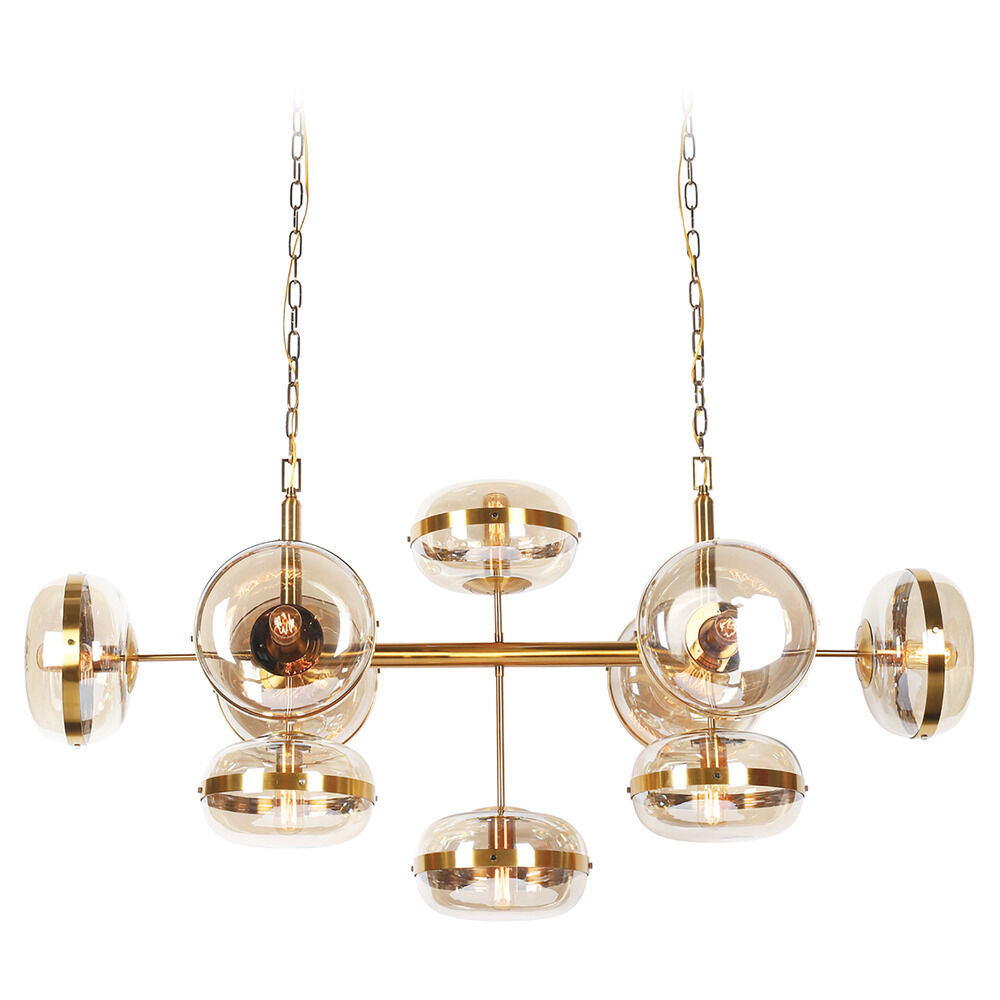 Nottingham 10-Light Oval Chandelier, Antique Brass Finish, Amber Tinted Glass Orbs with The rich brass color creates an inviting ambiance despite its industrially austere design. <li>Product Type: Chandelier<li>Fixture Style: Transitional<li>Shade Shape: Orb<li>Hanging Support Type: Chain<li>Hanging Support Length: 72 inches<li>Chain Length: 72 inches<li>Slope Ceiling Compatible: Yes<li>Location Type: DRY Location<li>Bulbs Included: Yes<li>Dimmable: NO<li>More information: 10 x 60W Edison Bulbs E26/120V (included)<li>More Information: Amber Tinted Glass Orbs Included<li>More Information: Hanging Support Type: Chain<li>More Information: Rated for dry locations<li>Canopy Backplate Length: 31 Inches<li>Canopy Backplate Height: 1 Inches<li>Canopy Backplate Width: 6 Inches