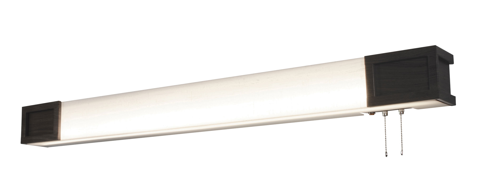 - Contemporary overbed fixture features a walnut finish and 4-way pull switch with night light