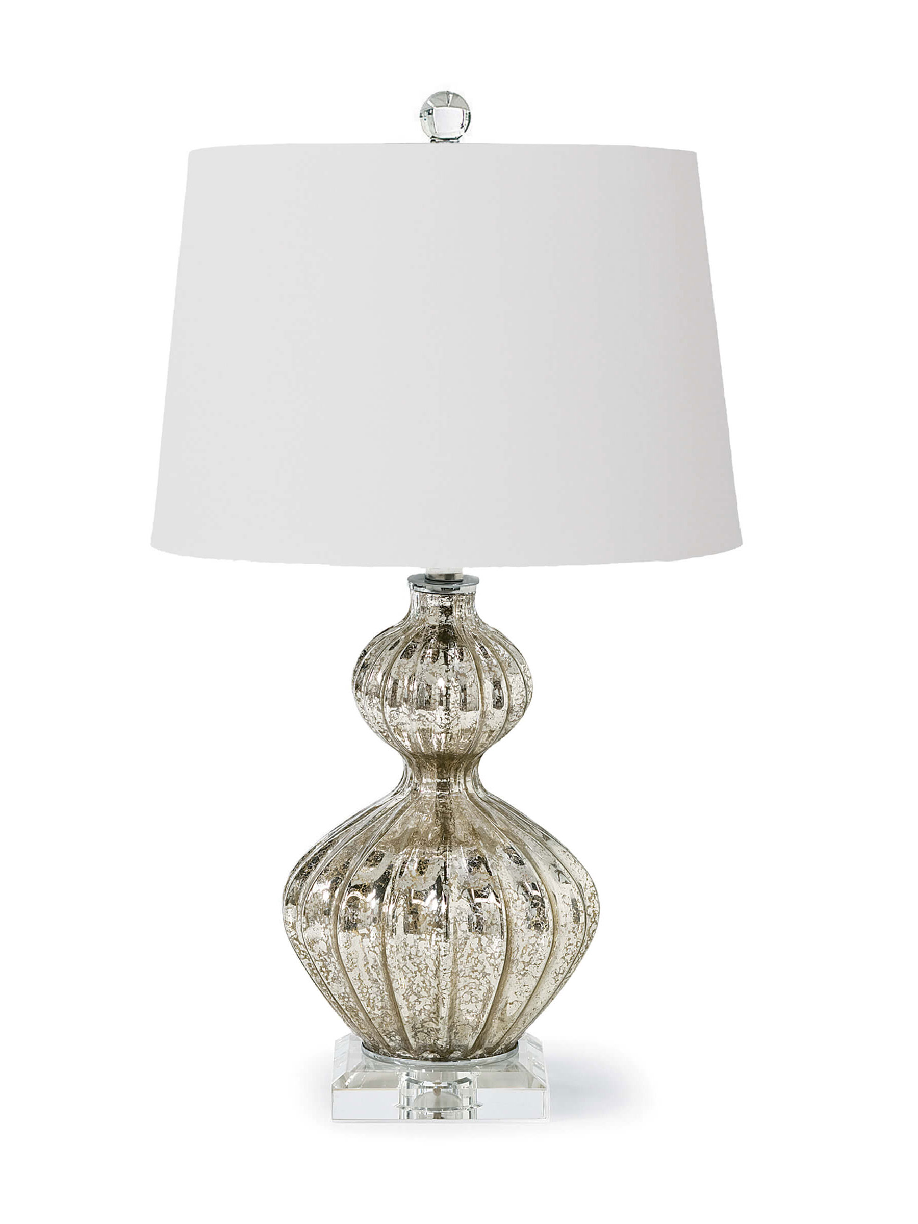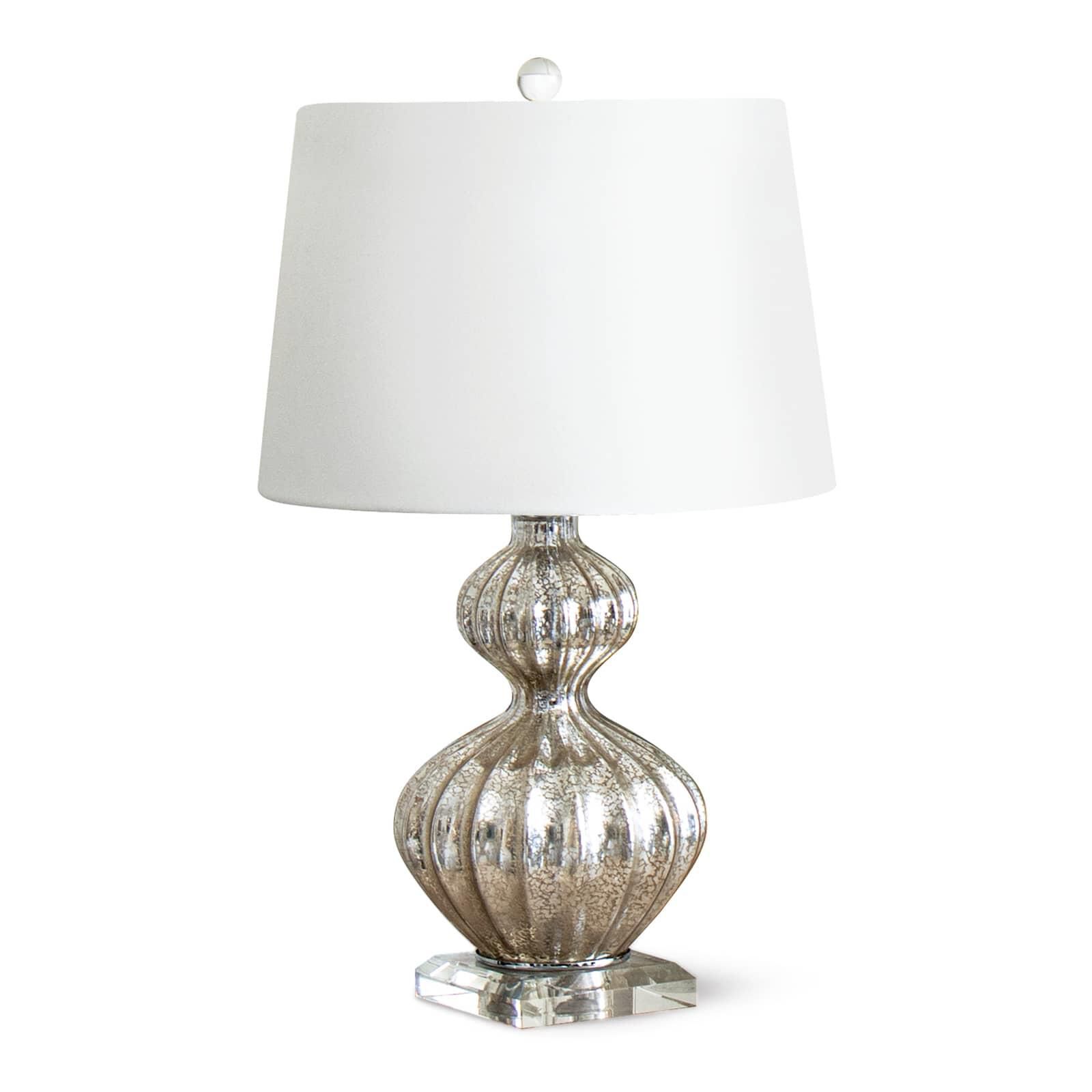 Regina-Andrew Design "Mercury" Mini Lamp DetailsAn antiqued-silver finish on rippling surface of this double-gourd mini lamp creates the look of mercury glass. Made of glass on a clear crystal base. Shade is linen. Three-way switch; uses one 150-watt bulb. 14"Dia. x 25"T. Imported. Material: Glass & Metal on crystal base with Linen Shade.