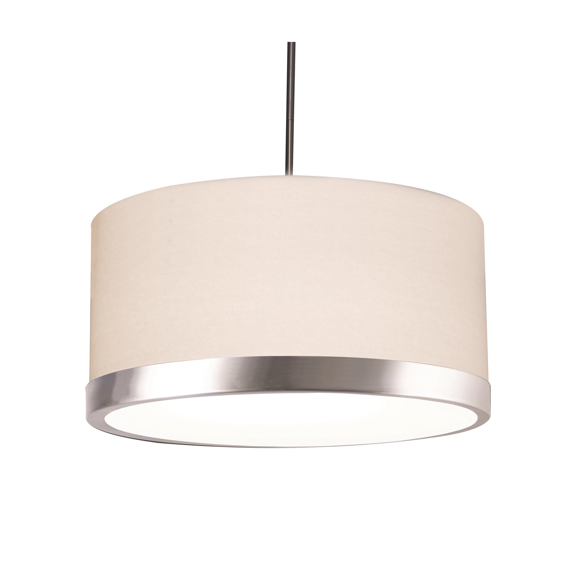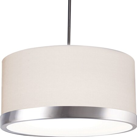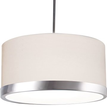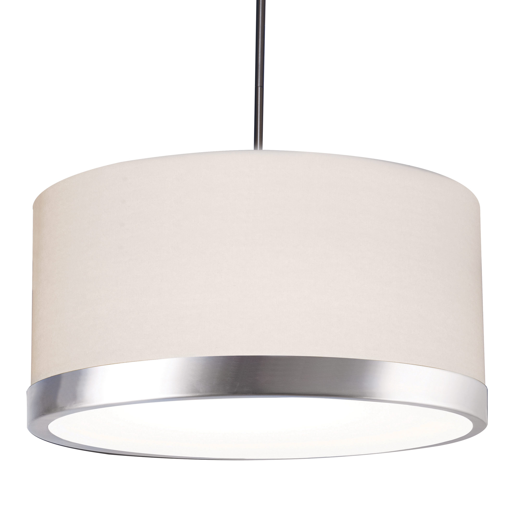 - Modern drum pendant featuring metal band accent, white acrylic bottom diffuser, and fabric shade