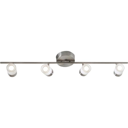 - The canopy and rail are plated in satin nickel, while the individual heads have a two-tone plated white and satin nickel with a clear lacquer topcoat finish.