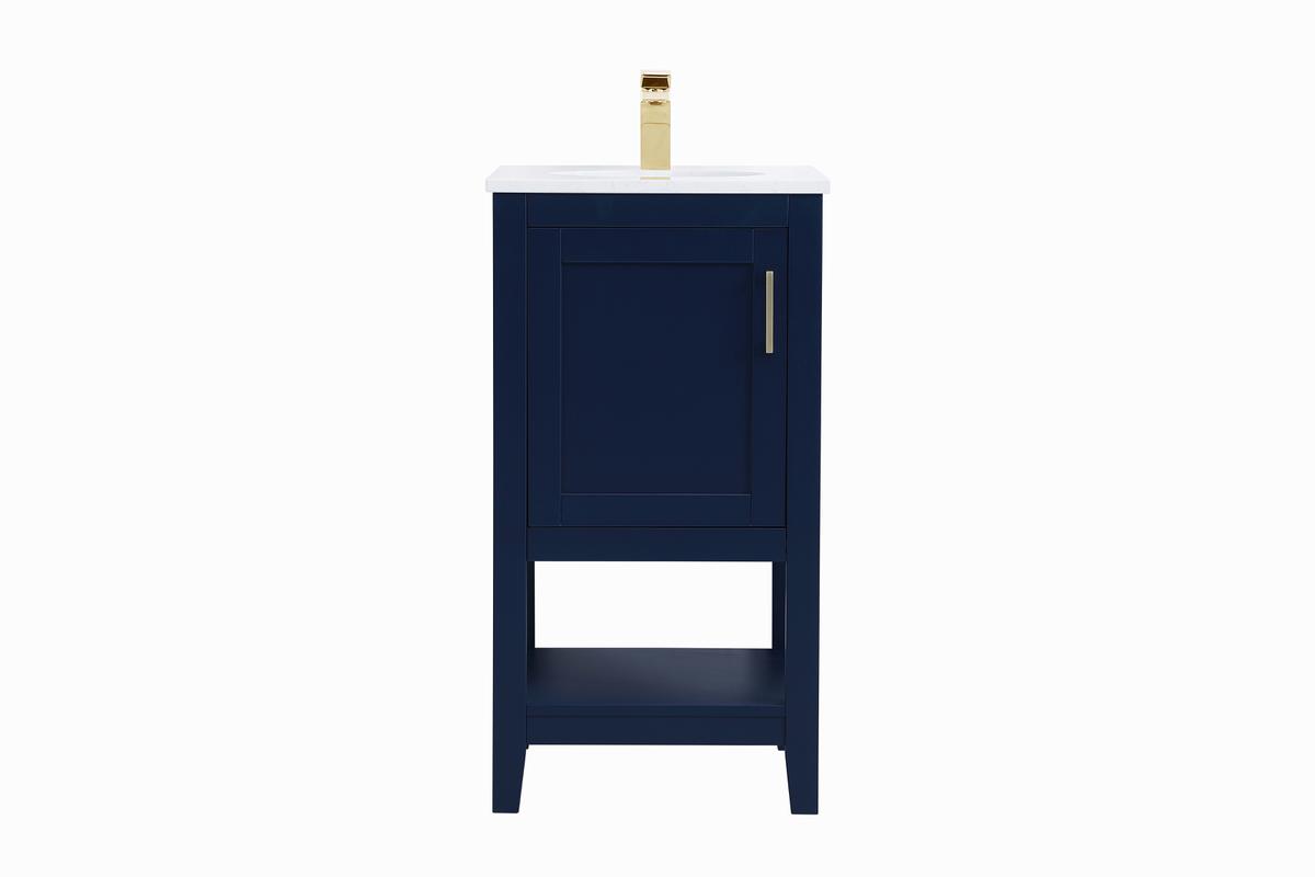 The nonchalant attitude of this 18" traditional Blue finish vanity will have you wanting more. The slender gold handle bar open the cabinet door to reveal an ample storage space to put away and store bathroom essentials, and the open space below allows for you to place clean towels on the rack. Topped with a Calacatta quartz countertop, you and your guests will enjoy this easy going vanity.