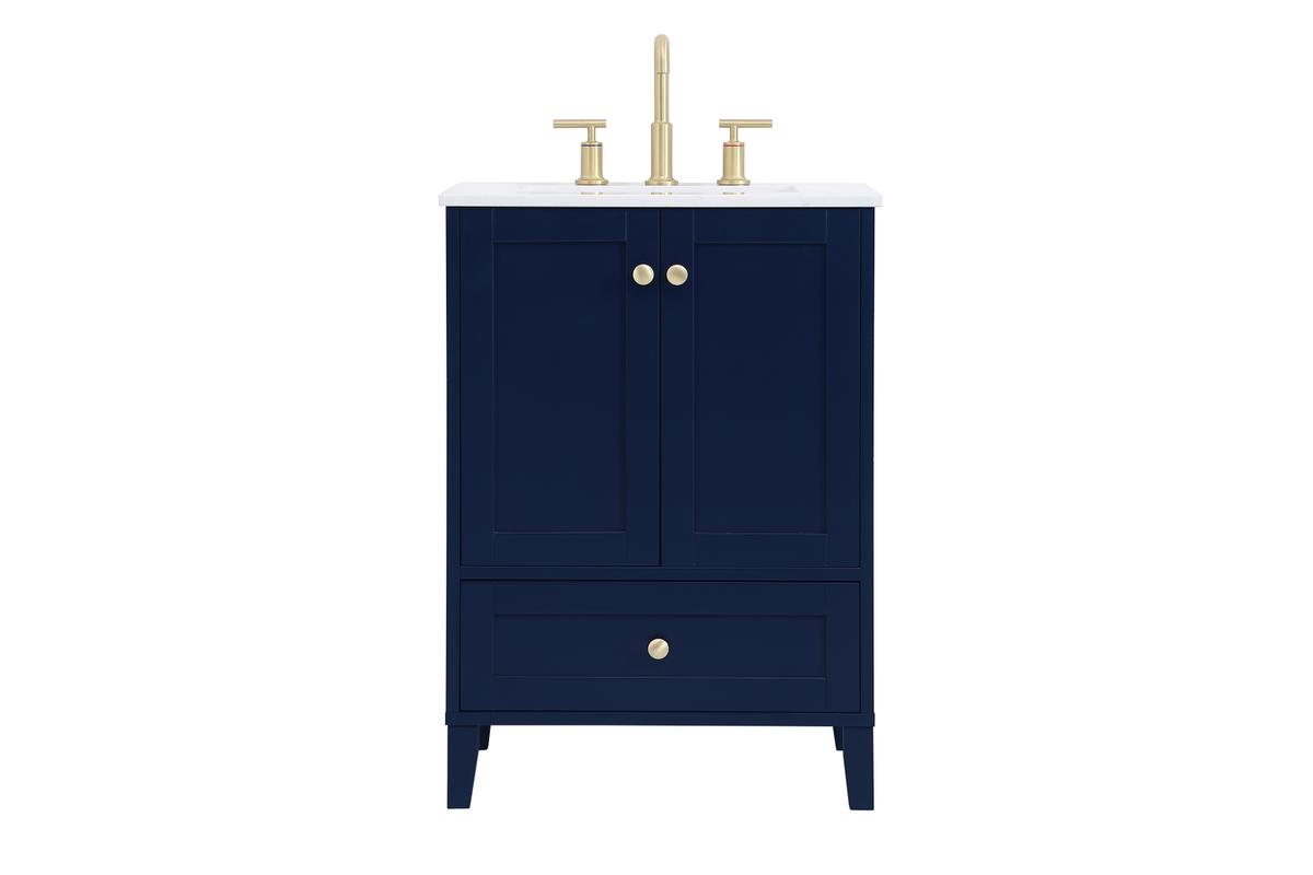 While unassuming, this 24" vanity in a Blue finish sure knows how to redefine luxury. The sleek gold knobs adorn the two cabinet doors and base drawer which allows you to store your bathroom toiletries and necessities. Standing strong on oblique legs and dressed with a calacatta quartz countertop, this vanity will surely create beauty and casual elegance in your bathroom or powder room.
