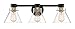 - Matte black finish with old satin brass finish accents over metal construction. Clear blown glass shades.