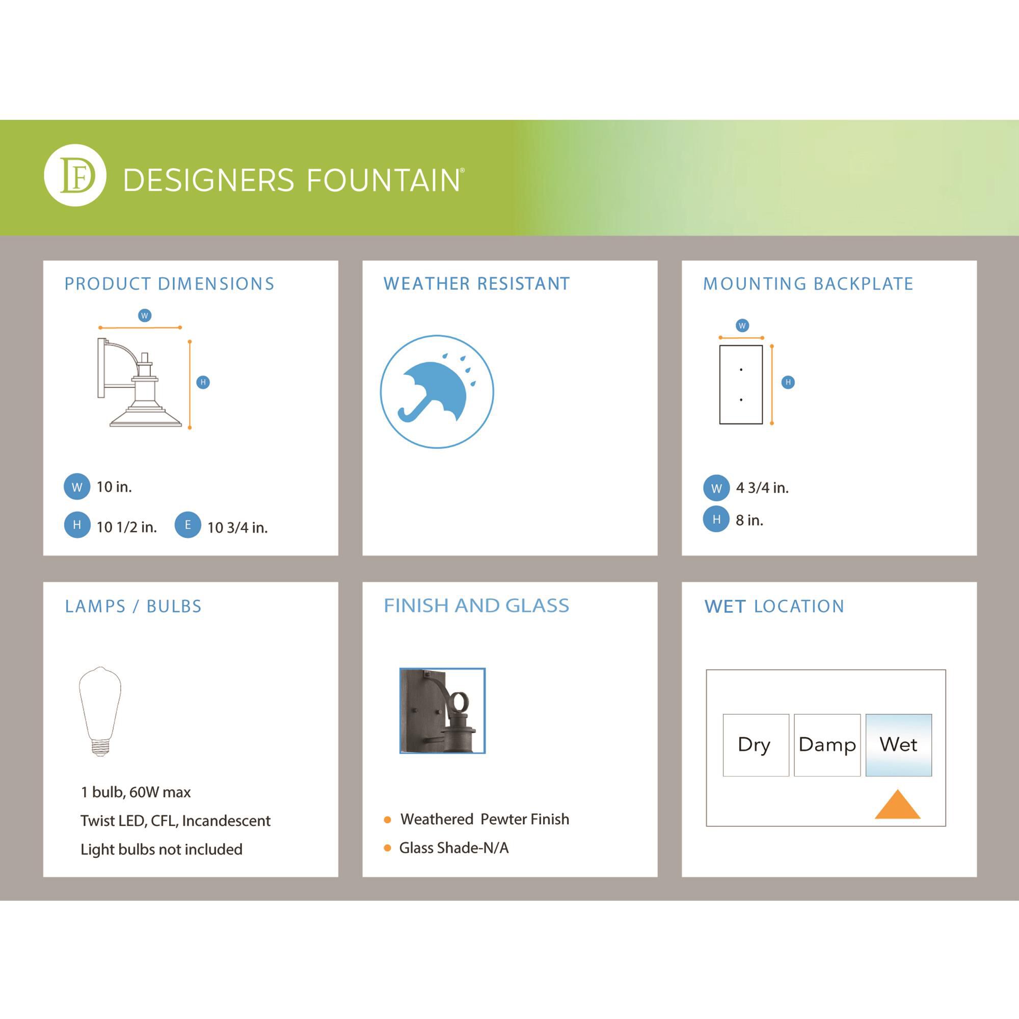 Designers Fountain Aurora 1 Light Outdoor Wall Lantern Sconce, Weathered Pewter, 10.5in W, D207M-10OW-WP