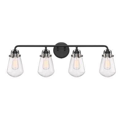 Embrace a touch of vintage style with the Elliott collection of bath lights from Designers Fountain. The study metal frame features a modern matte black finish, highlighting the vintage industrial riveting of the frame. The larger clear glass shades allows this fixture's four bulbs to shine without interference throughout any space. Highlight a mirror or bathroom vanity with this four light wall sconce, and bring a little steampunk coolness by using a vintage style light bulb.