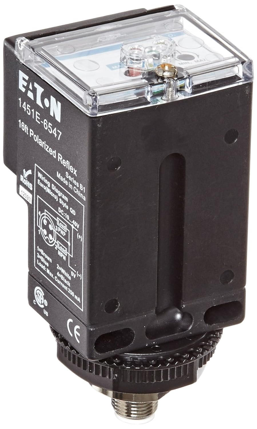 Eaton 1451E-6547 Enhanced Photoelectric Sensor, Polarized-Retroreflective Mode, 4-Pin micro DC-Style QD Connector, 10-40 VDC Input Voltage, Visible Red LED, 250 mA Bipolar (NPN/PNP) Output, 16' Sensing Range, Adjustable Gain