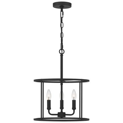 Bring sleek style to your modern decor with the addition of this industrial matte black three-light pendant from the Abner collection by Quoizel. Combining contemporary and industrial styles, its simple cylinder steel construction features a matte black finish. Three candelabra bulbs offer plenty of illumination. This industrial light is dimmable with the purchase of compatible dimming components.