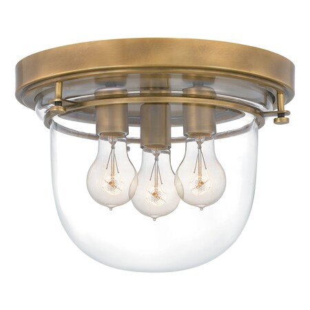 Light up a transitional living space in style. This three-light metal flushmount ceiling light by Quoizel is perfect for adding illumination without all the fuss. The simple, round frame is treated to a weathered brass finish for just the right touch of warmth. The clear glass shade puts the bulbs on full display for a brilliant display of light.