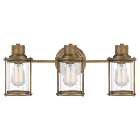 Add vintage-inspired character as you light your surroundings with a luminous glow. This three-light weathered brass metal bath light sets the stage for a well-decorated bathroom with its cool, classic silhouette. Brought to you by Quoizel, this piece is pulled together with clear ribbed glass shades for textural elegance.
