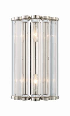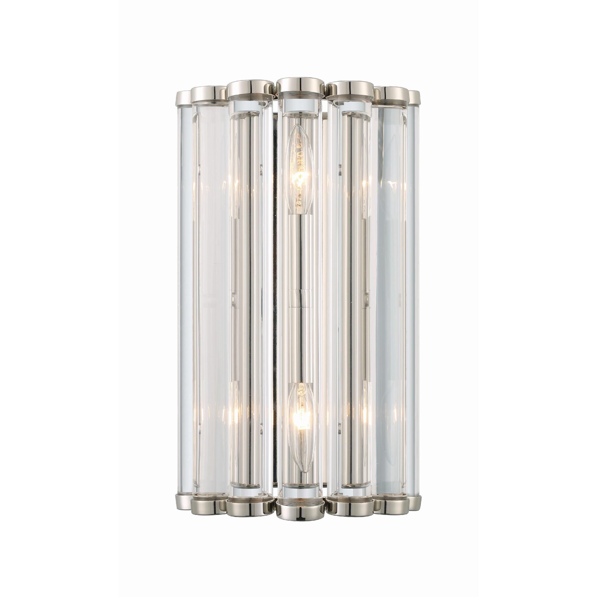 Designed by Libby Langdon for Crystorama, the Elliot collection of wall lights combines traditional crystal with distinctly contemporary design. Clear crystal glass tubes are arranged across the face of this wall scone, framed by polished nickel finish accents. Within, two candelabra bulbs shine like candlelight, their illumination diffused through the crystalline glass. A scallop pattern displays itself across the bottom, ensuring the Elliot collection is pleasing to the eye, no matter the angle.