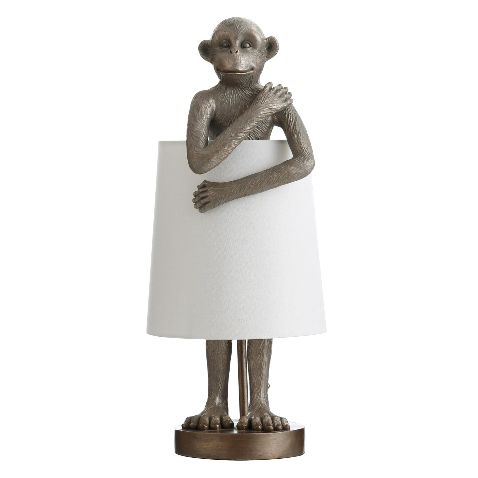 - Featuring an antique brass finish, the charming Ravena table lamp looks like a standing monkey holding a white "towel" shade. The light blue and silver undertones of the frame's brass finish ensure this lamp will blend into the decor of any living room or family room. The charming look of this animal table lamp is sure to elicit smiles.FeaturesDue To The Production Process, Each Piece Is Unique And No Two Are Exactly Alike
