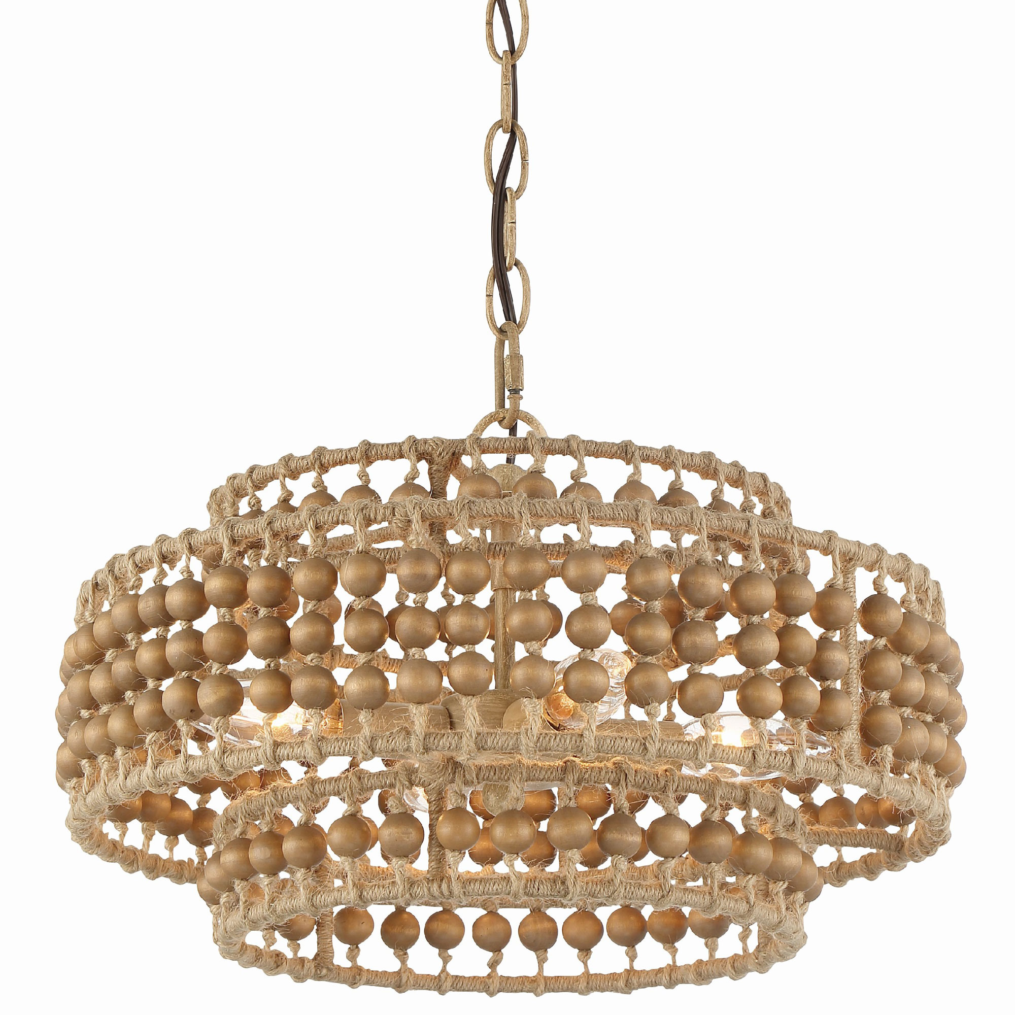 The Silas interlaces natural wood beads with jute rows, bringing an organic element to its environment. A series of beads are strung together, taking on a handmade aesthetic that creates an inviting and casual style to a room.