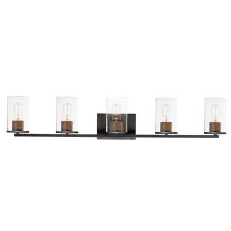 Cylinders in Clear Seedy glass on simple matte Black frames with Antique Brass socket covers. A clean and easily maintained fixture that easily coordinates with your stylish bathroom space. <UL>Warranty: 3 Years<LI>Mounting Direction: Up/Down / Shade Included: Yes / Dimable: Yes.