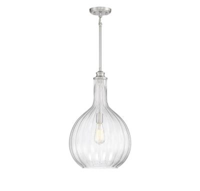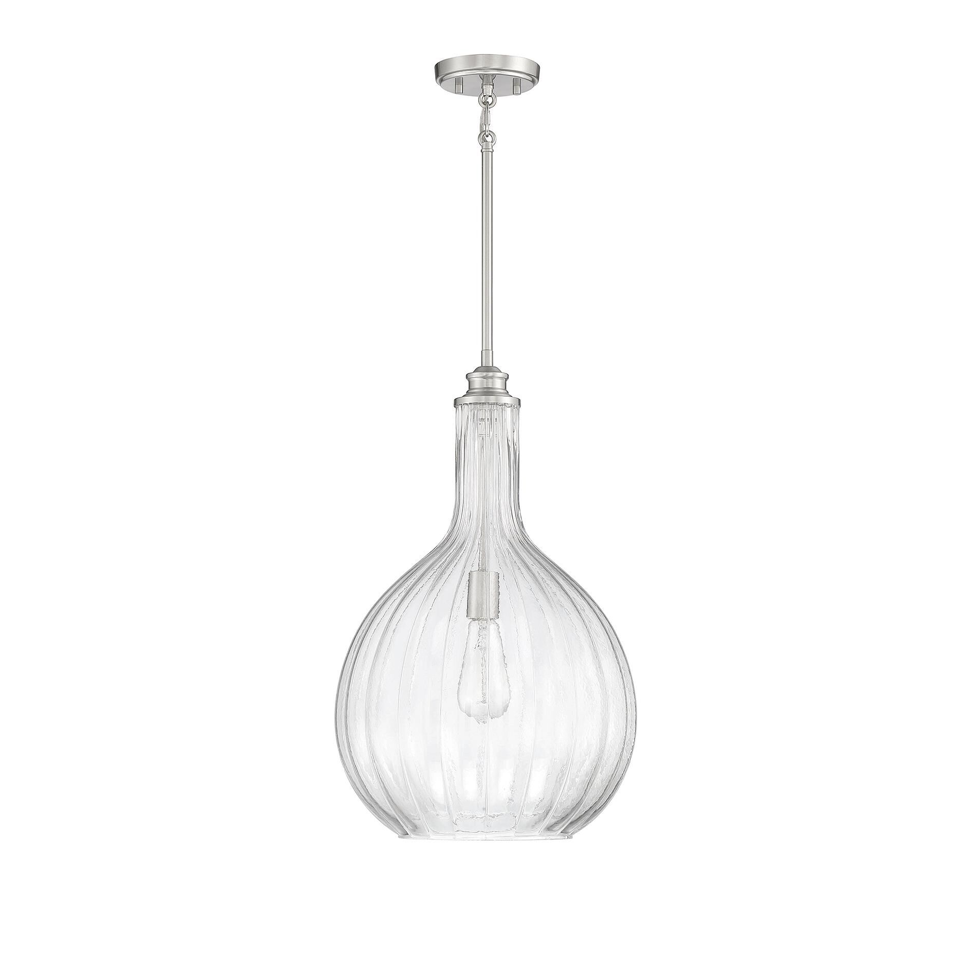 The generously proportioned Brandon Collection brings a clean look to any space with a clear, fluted blown glass shade and Satin Nickel accents. This one-light pendant has an adjustable height from 22" to 77" and provides illumination from one 60-watt Edison-base bulb.