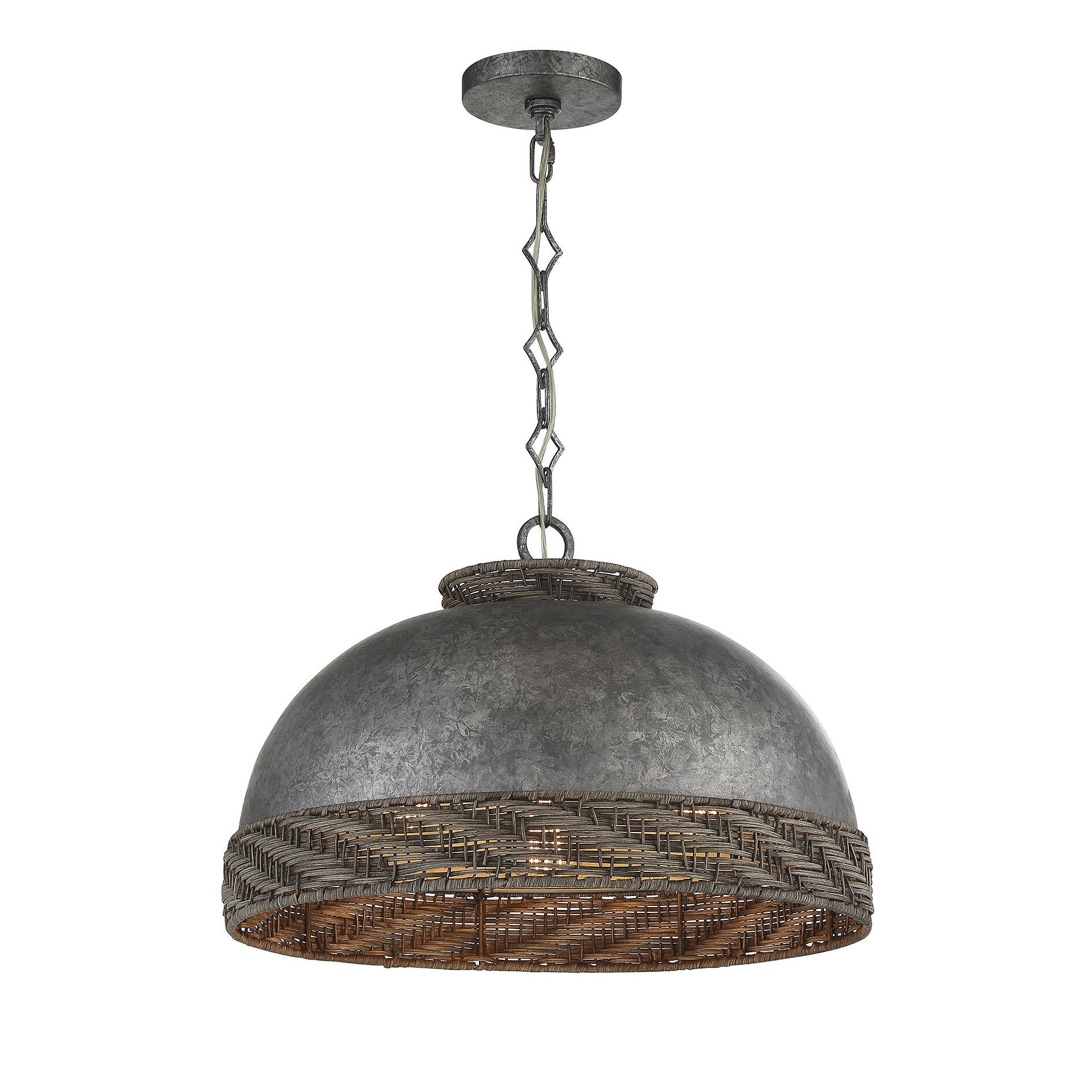 The Tripoli Collection offers an industrial vibe from the Mottled Zinc dome softened by Gray rattan trim for an organic touch. Measuring 19¾" wide x 13" high, this single-light pendant provides ample illumination from three 60-watt Edison-base bulbs.